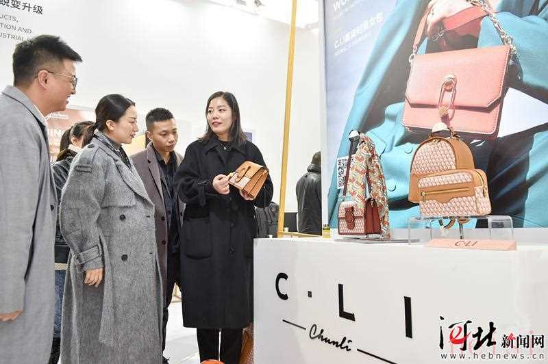 11月22日,河北春麗皮具有限公司工作人員(右一)向參觀者介紹新產(chǎn)品。 記者趙海江 趙杰攝