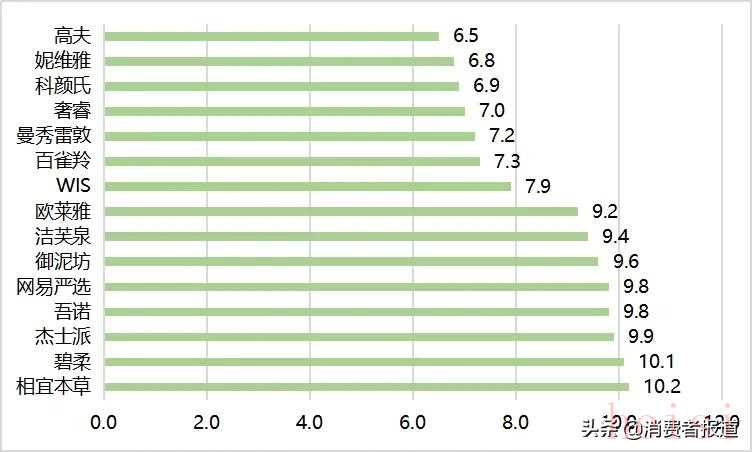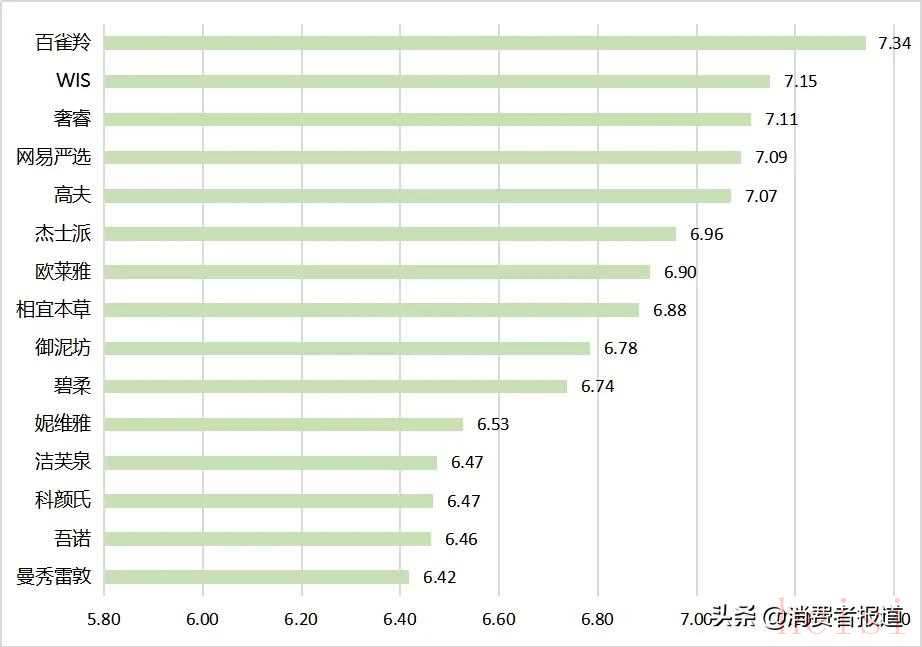 本次感官評價綜合評分排名前三的品牌為百雀羚、WIS和奢睿,得分分別為7.34,7.15和7.11。參評的15款男士洗面奶感官評價綜合評分如下: