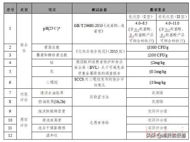 本次比較試驗檢測項目采用國家標準方法、實驗室通用方法進行檢測,從安全性、功效評價和感官評價三大方面展開男士洗面奶產(chǎn)品品質(zhì)比拼,詳細項目與要求見表1。