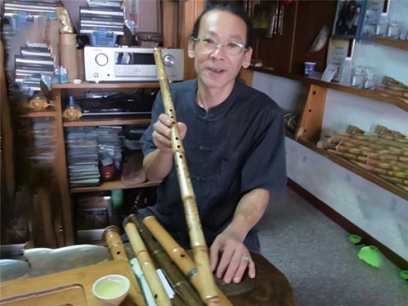 1957年生于臺灣南投竹山的廖錦棟,自幼研習(xí)南管音樂,師從多位民間大師,將漢詩吟唱與月琴伴奏融入洞簫制作。其作品融入臺灣古調(diào)元素,音色醇厚中帶著絲竹清韻,仿佛能聽見百年前的南音雅集。每支洞簫均刻有古典詩詞,兼具樂器與藝術(shù)品雙重價值。廖錦棟獨創(chuàng)“低溫烘竹防裂”工藝,解決紫竹易開裂難題,更曾參與《南管曲牌大全》錄制,并在法國、日本等國際音樂會上展示,成為臺灣古調(diào)傳承的代表。3、蔡鴻文
