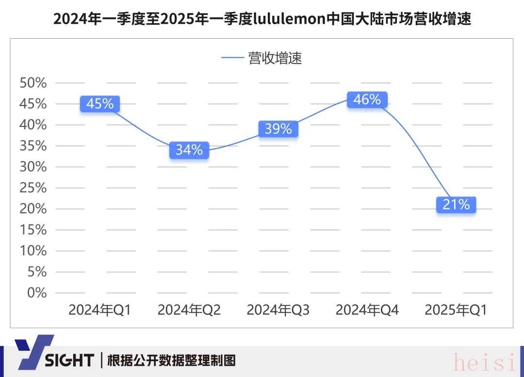但lululemon的黃金增收引擎實(shí)際也在放緩。2024年一季度至2025年一季度,lululemon中國大陸市場單季營收增速分別為45%、34%、39%、46%、21%,呈波動下行趨勢。
