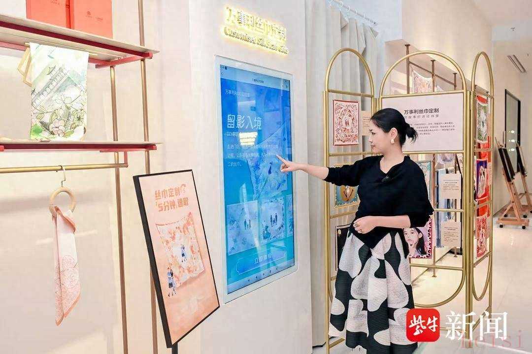 記者在現(xiàn)場親身體驗了這場“科技魔術(shù)”。在小程序上輕點選擇“江寧織造”主題門店,上傳一張個人照片,挑選水彩風(fēng)格,只見AI系統(tǒng)瞬間啟動,將人像與玄武湖光影、梧桐落葉及南京紅樓文化紋飾智能融合,屏幕上旋即生成了一條專屬的絲巾設(shè)計圖。短短5分鐘后,一條還帶著機(jī)器余溫、觸感柔滑的絲巾便新鮮出爐,將個人記憶與南京韻味永久定格于方寸絲綢之上。
