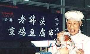 老韓頭原名韓再發(fā),回族人,祖籍山東韓家寨。從小和父親闖關(guān)東來到吉林農(nóng)安小合隆,開了家牛肉鋪維持生活。上世紀(jì)50年代,韓再發(fā)別出心裁地把干豆腐里夾上蔥花、辣椒沫、芝麻、香菜,包成小卷,再用小棍兒串起來賣,老韓頭豆腐串一步一步打響了名號(hào)。如今的老韓頭產(chǎn)品豐富了許多,鵪鶉蛋、醬牛肉、松花雞腿等都頗受歡迎。