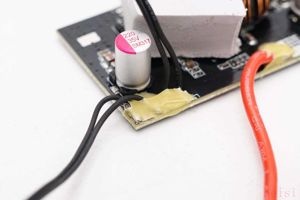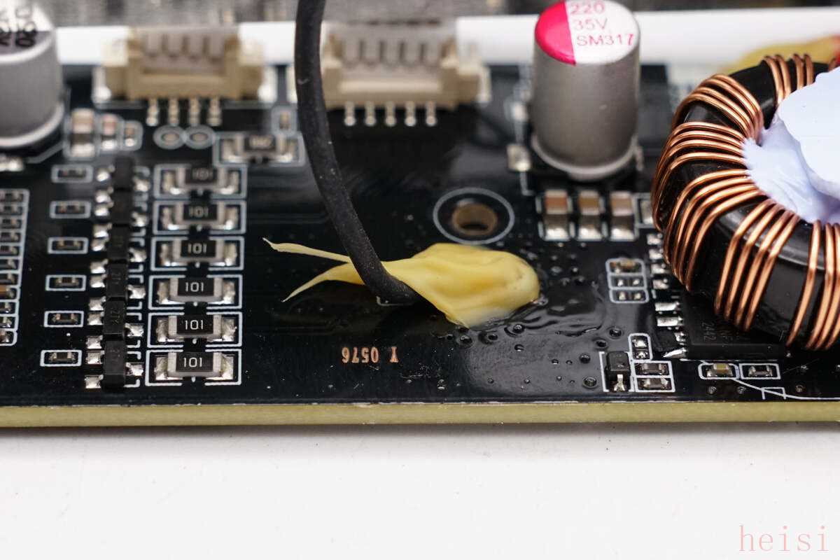 兩顆熱敏電阻與主板錫焊處也打膠保護(hù)。