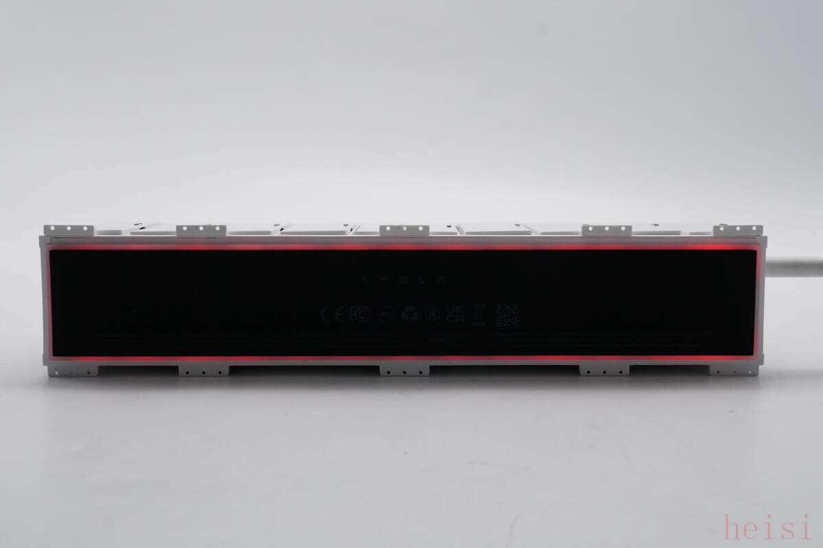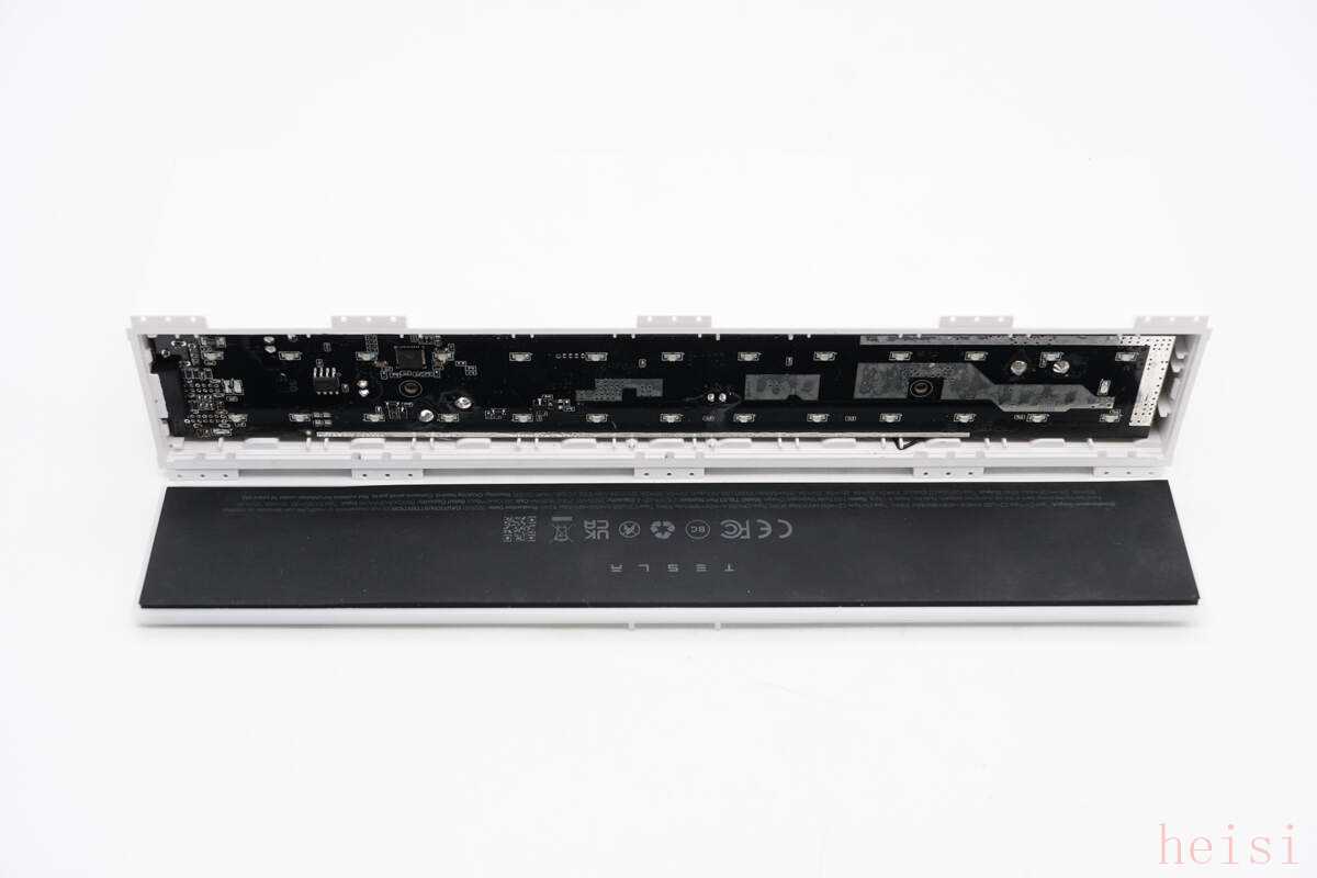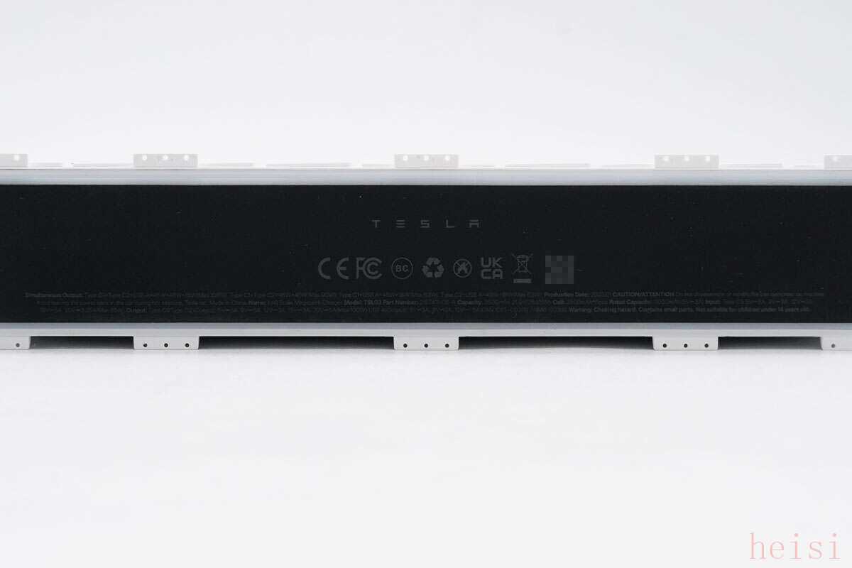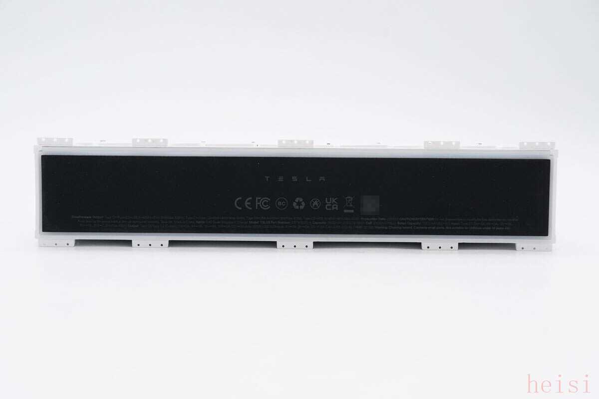 底部中心同樣設(shè)計(jì)有特斯拉品牌logo和產(chǎn)品名稱,兩側(cè)貼有產(chǎn)品信息貼紙。