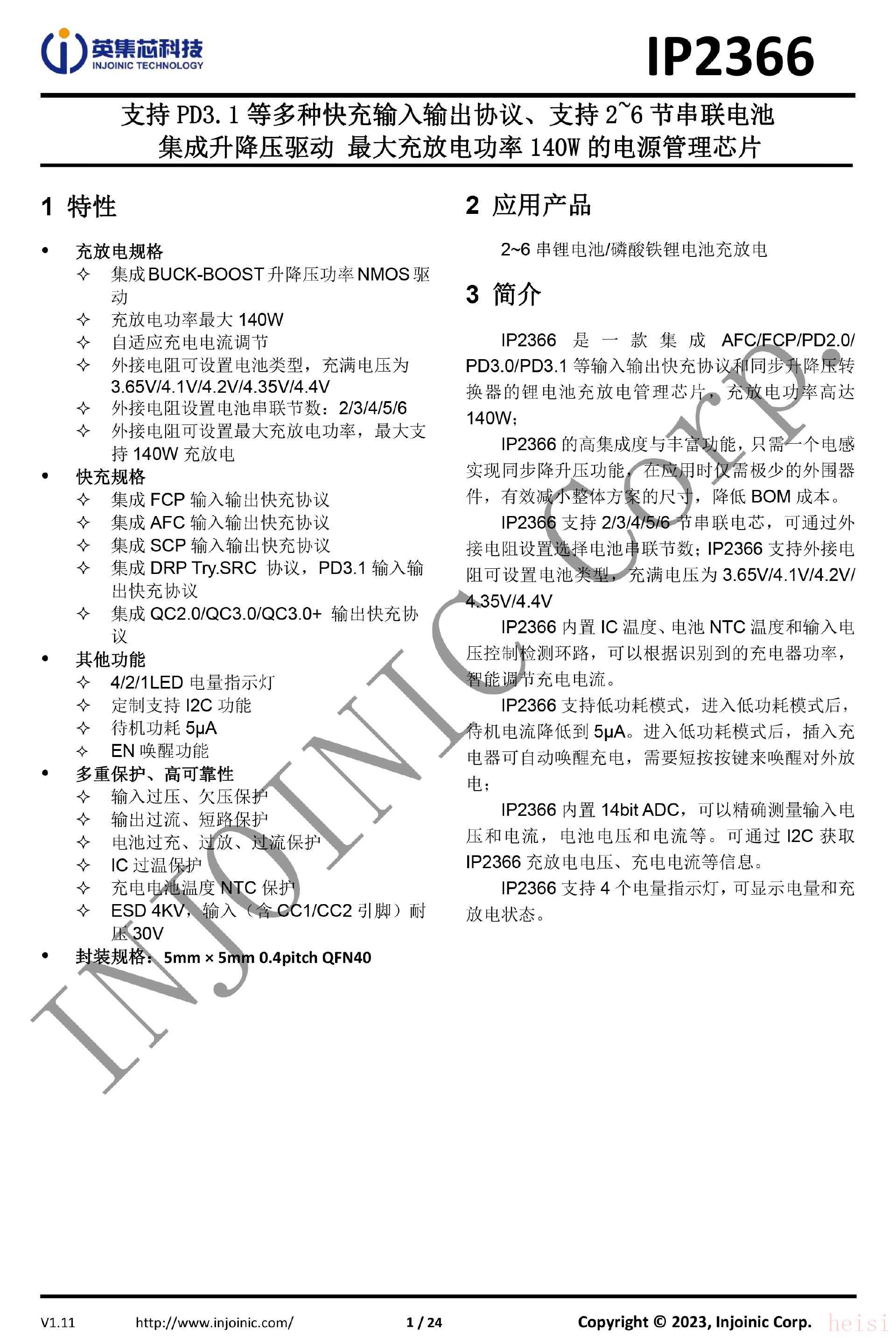 IP2366采用5*5mm 0.4pitch QFN40 封裝,支持輸入過(guò)壓、欠壓保護(hù),輸出過(guò)流、短路保護(hù),電池過(guò)充、過(guò)放、過(guò)流保護(hù),芯片過(guò)溫保護(hù),充電電池溫度NTC保護(hù)等多重保護(hù)措施,可靠性高。CC1/CC2 引腳均支持30V耐壓,可有效防止產(chǎn)品損壞。
