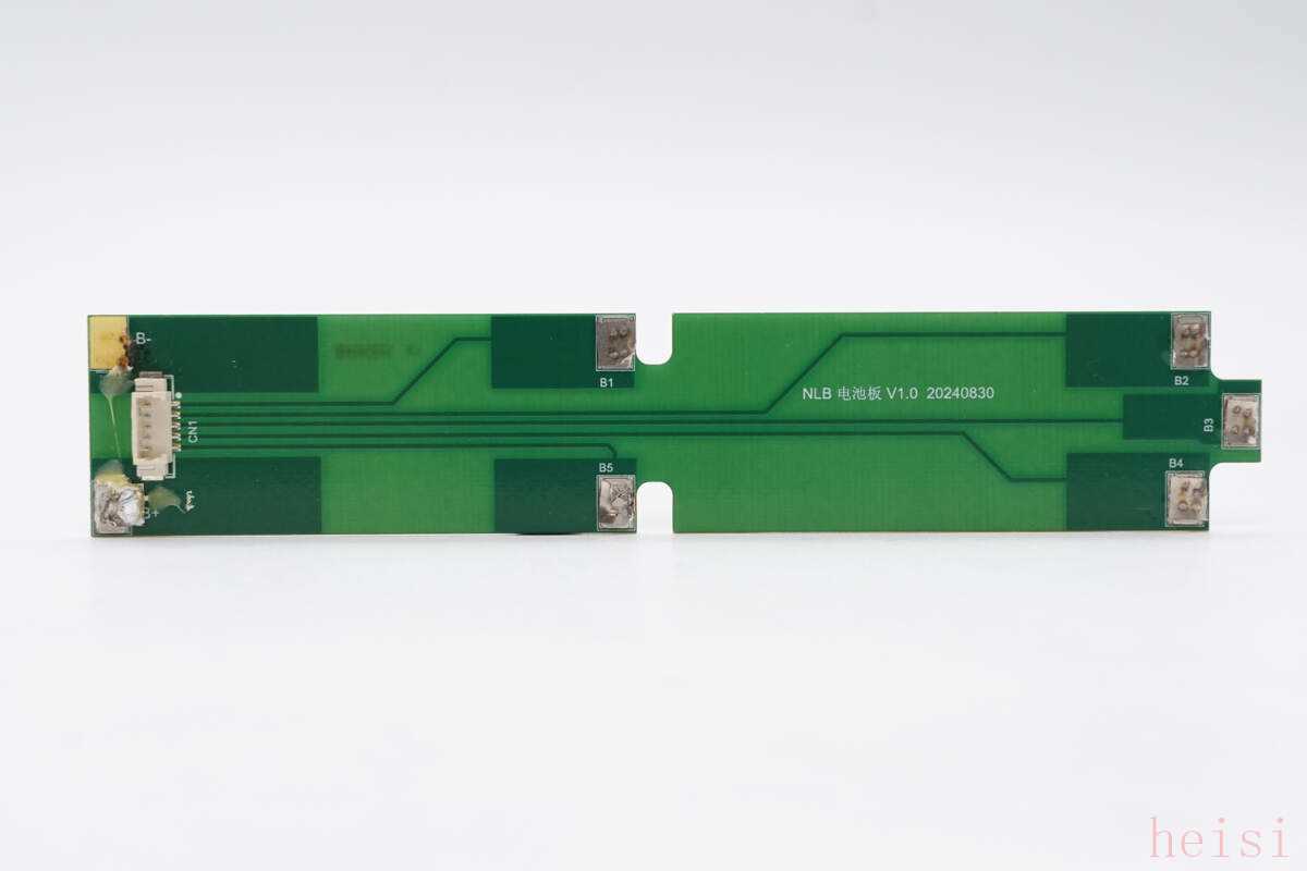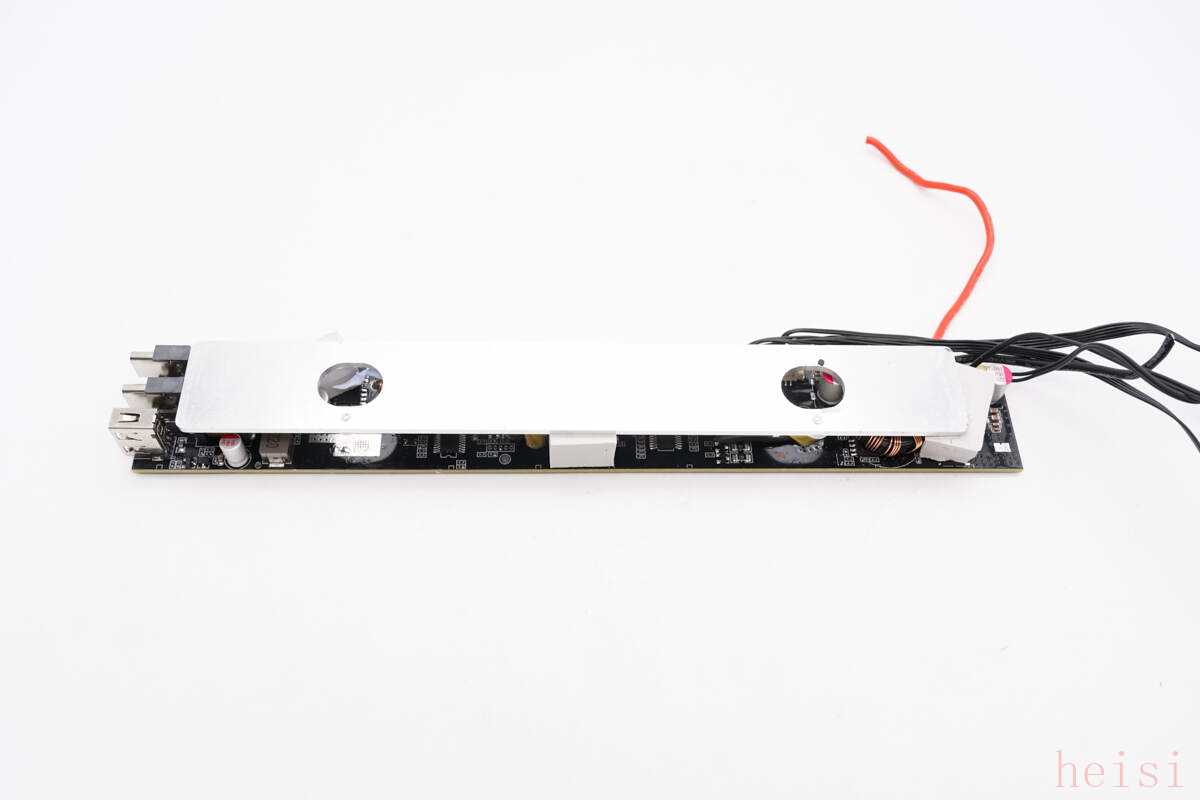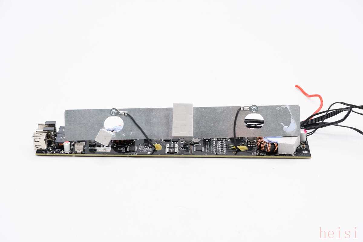 移動(dòng)電源主控PCB板正面覆蓋金屬散熱板,并且邊緣連接多組導(dǎo)線。