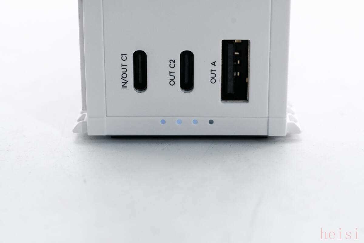 接口下方還設(shè)計(jì)有四顆電量指示燈,指示燈亮藍(lán)光,每顆代表25%電量,方便用戶查看剩余電量。