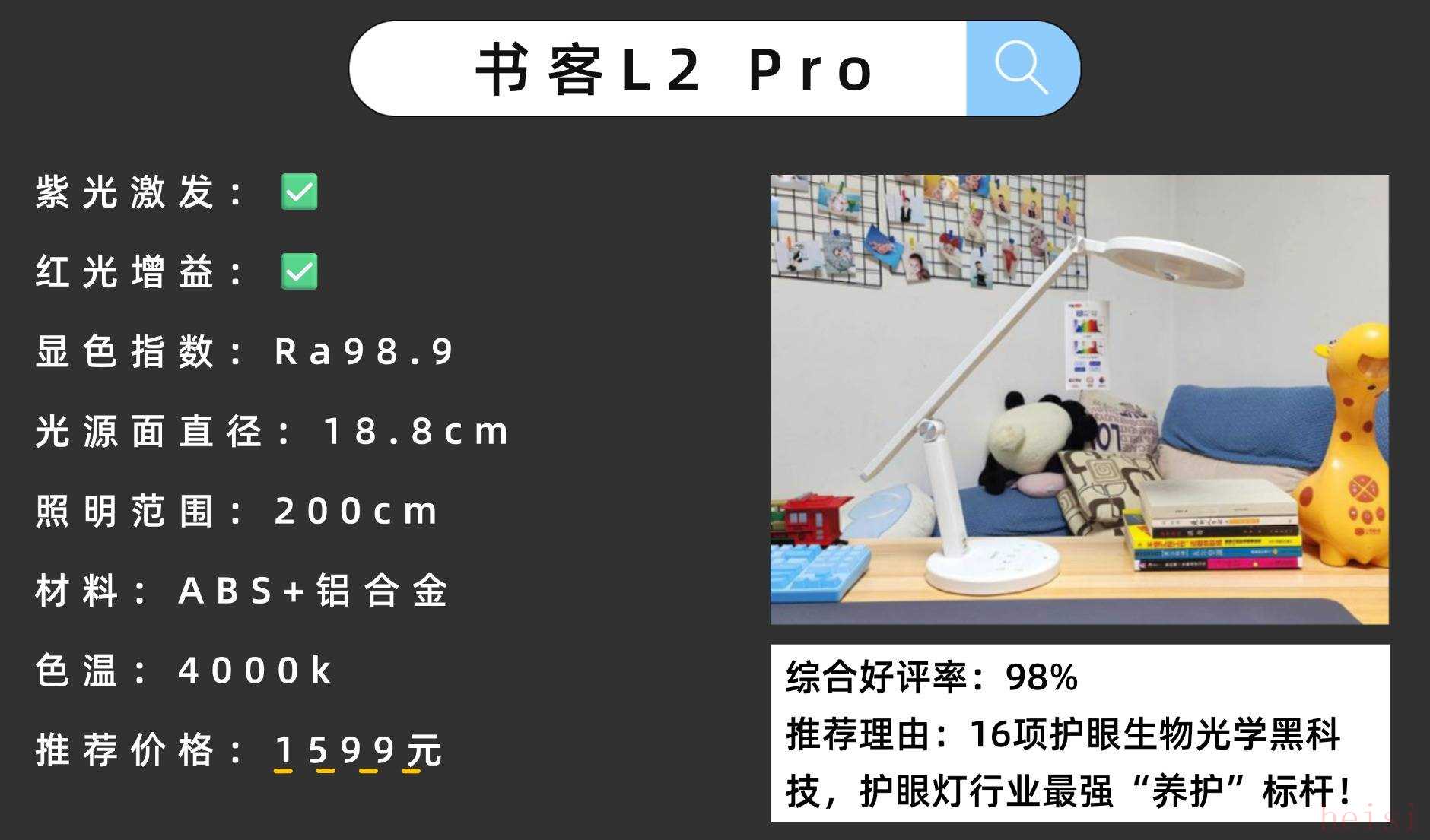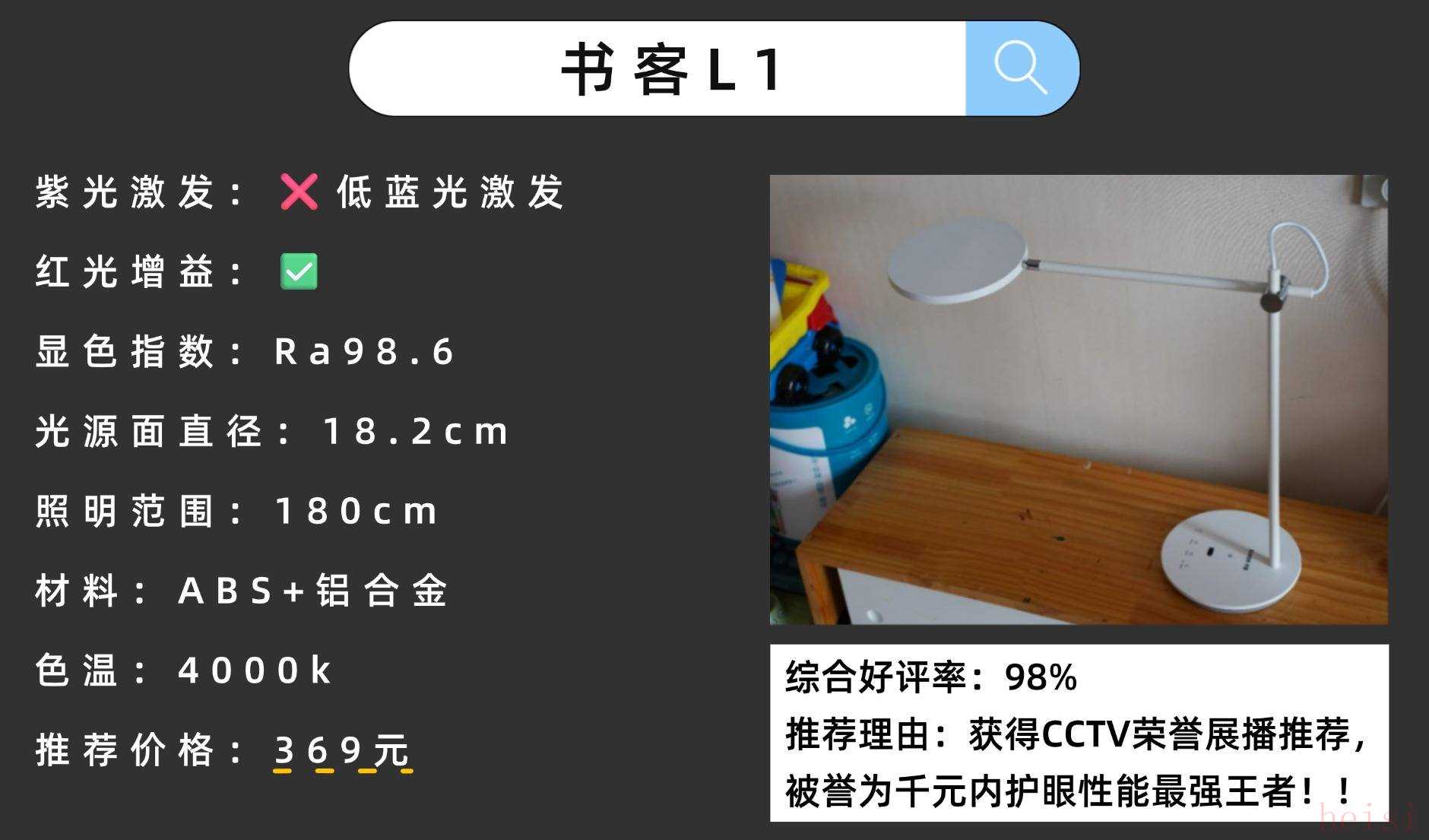 在照明方面采用了單面發(fā)光技術(shù),可覆蓋約1米的桌面區(qū)域,雖然照明面積不夠大但也足夠滿足日常書寫等照明需求。在功能操作方面支持手機(jī)APP遠(yuǎn)程操控和智能語音等模式,還有多種學(xué)習(xí)模式可以調(diào)節(jié)。精選高性價(jià)護(hù)眼臺(tái)燈10:書客L1護(hù)眼性能:SDIT自適應(yīng)調(diào)光+RRT紅光養(yǎng)眼技術(shù);模擬自然光規(guī)律,有效降低80%近視風(fēng)險(xiǎn)。官網(wǎng)價(jià)格:329元性價(jià)比指數(shù):★★★★★(千元內(nèi)護(hù)眼性能王者,權(quán)威認(rèn)證齊全,極具性價(jià)比)推薦理由:罕見獲得CCTV榮譽(yù)展播推薦,被譽(yù)為千元內(nèi)護(hù)眼性能最強(qiáng)王者!