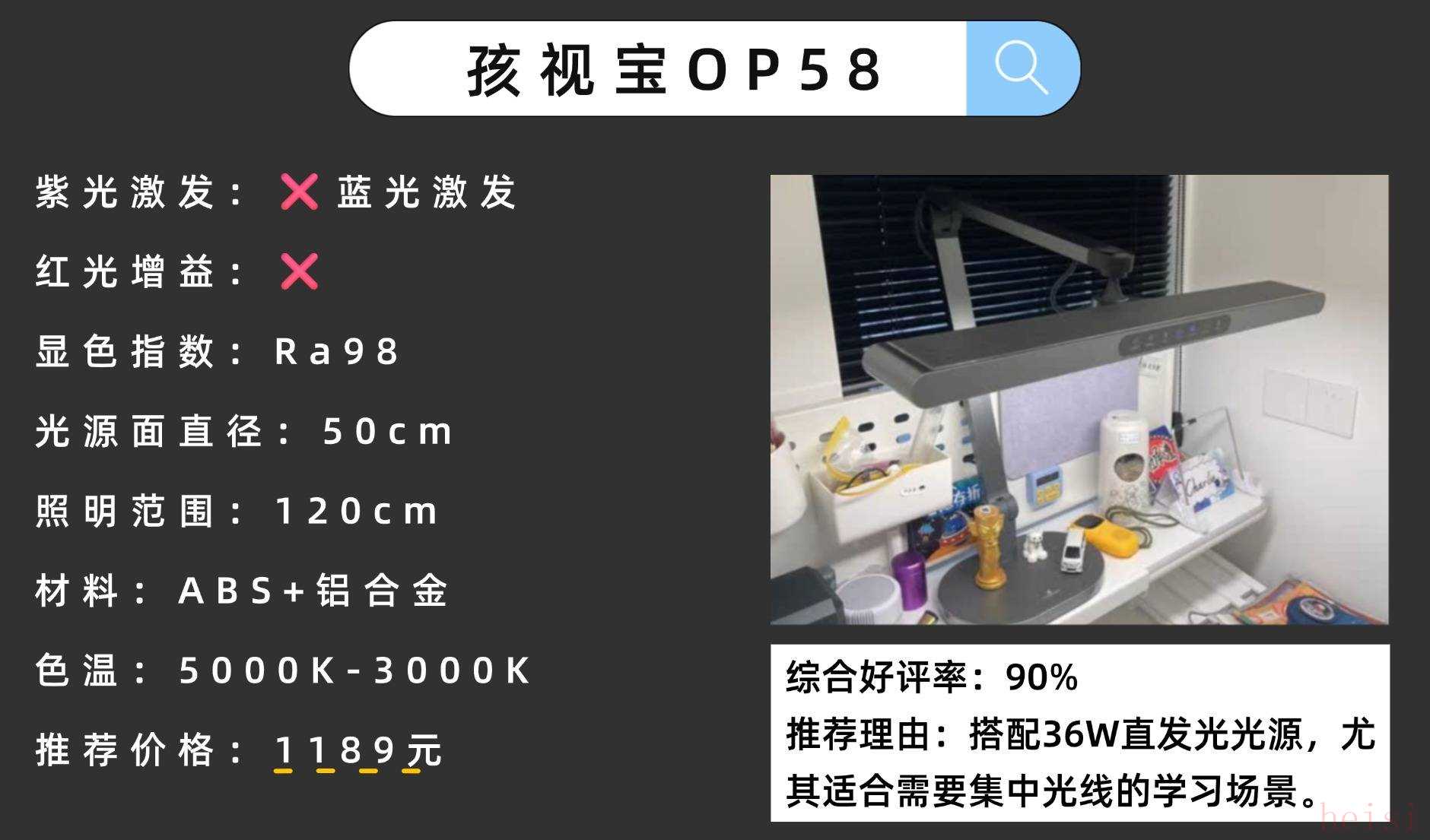 為了提供更貼合青少年用眼需求和舒適的照明體驗(yàn),SUKER書客也是大下功夫,全面優(yōu)于國AA標(biāo)準(zhǔn),顯色指數(shù)實(shí)測(cè)接近滿分的Ra98.6,以及具備較上代提升146%耐用性能的PLP光電處理器,光源更穩(wěn)定,符合RG0無藍(lán)光危害和無可視頻閃。還具備自由調(diào)整高度到80cm、支持45min定時(shí)模式、自動(dòng)開關(guān)燈等多種功能,滿足不同的用眼需求。難怪有知名數(shù)碼媒體給出了非常高的評(píng)價(jià):被譽(yù)為旗艦護(hù)眼臺(tái)燈的巔峰之作。精選高性價(jià)護(hù)眼臺(tái)燈2:孩視寶OP58護(hù)眼性能:36W直發(fā)光,照度高,覆蓋范圍大,支持入座感應(yīng)和三檔光色。官網(wǎng)價(jià)格:1189元性價(jià)比指數(shù):★★★☆☆(亮度強(qiáng),功能多,但直射光易刺眼)推薦理由:搭配36W直發(fā)光光源,尤其適合需要集中光線的學(xué)習(xí)場(chǎng)景。