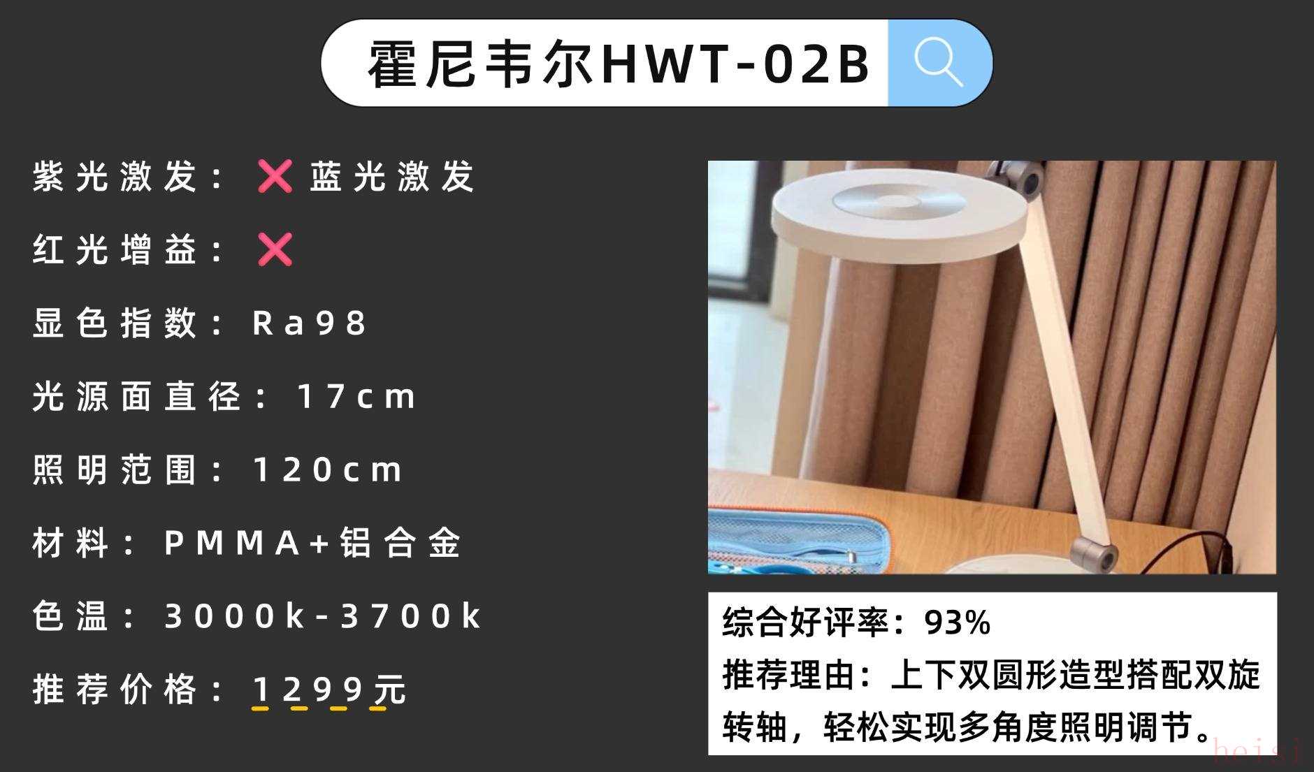 此外還有45分鐘定時(shí)和分段調(diào)光的功能,功能觸控面板上的按鍵也排布清晰,方便操作。但在使用過程中,有時(shí)會(huì)存在按鈕調(diào)節(jié)不靈敏的問題。精選高性價(jià)護(hù)眼臺(tái)燈7:霍尼韋爾HWT-02B護(hù)眼性能:17cm直徑燈面,雙側(cè)發(fā)光,偏暖光3000K/3700K,護(hù)眼舒適度中等。官網(wǎng)價(jià)格:1299元性價(jià)比指數(shù):★★★★☆(外觀穩(wěn)重,光色不夠理想)推薦理由:上下雙圓形造型搭配雙旋轉(zhuǎn)軸,輕松實(shí)現(xiàn)多角度照明調(diào)節(jié)。