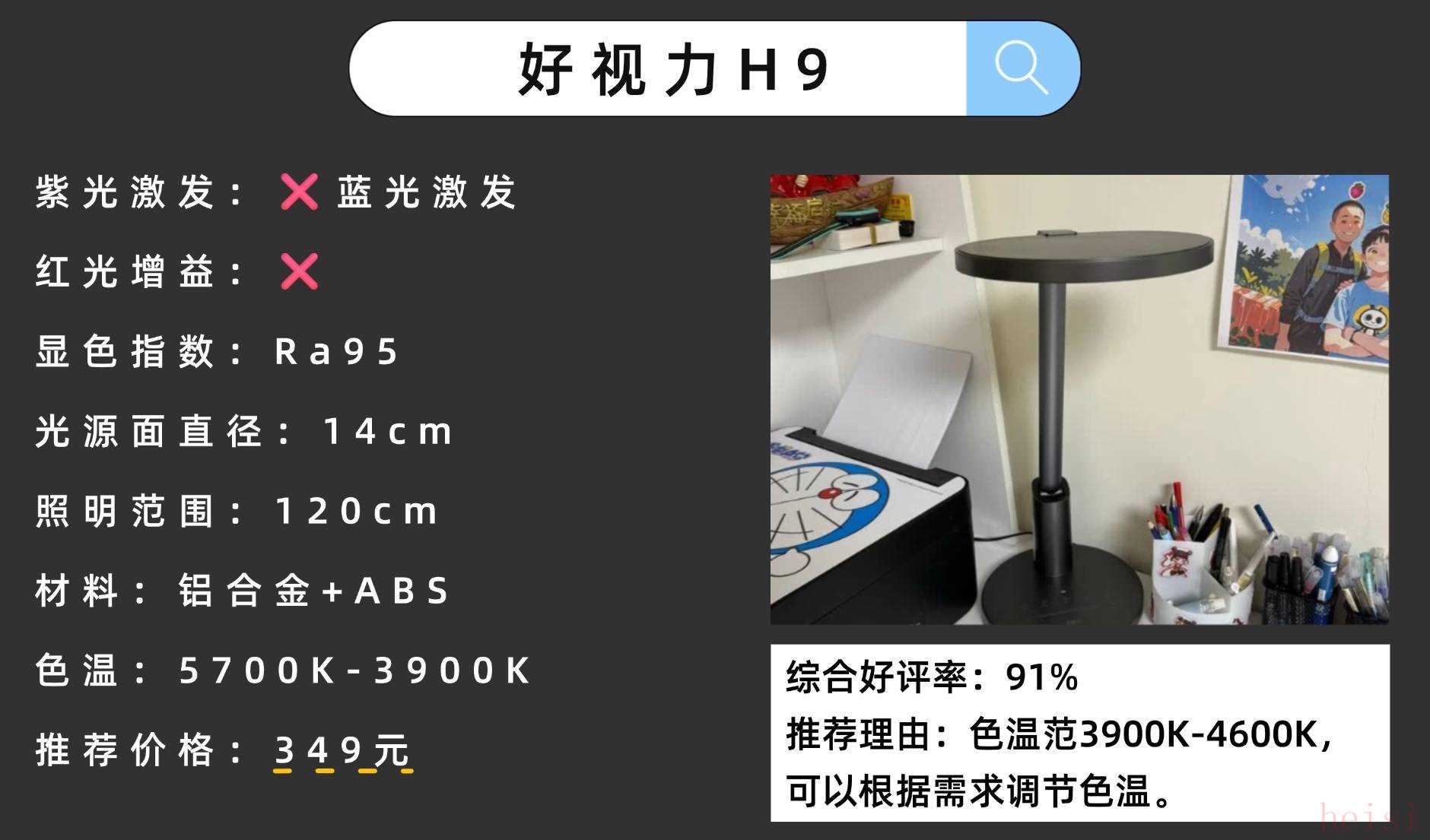 其光源面尺寸為25cm,但因發(fā)光面由兩個(gè)小弧形組成并采用直發(fā)光技術(shù),容易存在明暗不均現(xiàn)象距離中心點(diǎn)50cm處光照均勻度為2.83。不過其功能配置較為豐富,涵蓋定時(shí)模式、智能調(diào)光及入座感應(yīng)等,兼顧實(shí)用性與便捷性。精選高性價(jià)護(hù)眼臺(tái)燈5:好視力H9護(hù)眼性能:3900K–4600K色溫可調(diào),側(cè)發(fā)光,藍(lán)光較高,護(hù)眼效果中規(guī)中矩。官網(wǎng)價(jià)格:349元性價(jià)比指數(shù):★★★☆☆(價(jià)位適中,護(hù)眼性能一般)推薦理由:它的色溫范圍比較廣3900K-4600K,可以根據(jù)需求調(diào)節(jié)色溫。
