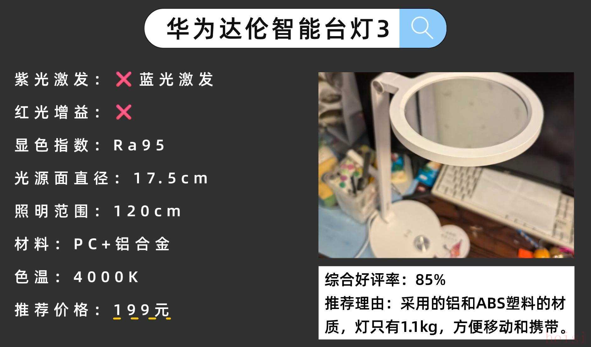 此外,還在燈頭和燈桿處設(shè)置了多個(gè)轉(zhuǎn)軸,可以適配不同年齡段的兒童。在色溫調(diào)節(jié)方面,琪朗護(hù)瞳Pro提供從3000K到5000K的調(diào)節(jié)范圍,可以根據(jù)需求選擇各種照明場(chǎng)景。精選高性價(jià)護(hù)眼臺(tái)燈9:華為達(dá)倫智能臺(tái)燈3護(hù)眼性能:單面發(fā)光,覆蓋約1米,支持APP遠(yuǎn)程控制和語音操控,多模式學(xué)習(xí)模式。官網(wǎng)價(jià)格:229元性價(jià)比指數(shù):★★★★☆(智能化亮點(diǎn)突出,但照明面積有限)推薦理由:采用的鋁和ABS塑料的材質(zhì),燈只有1.1kg,方便移動(dòng)和攜帶。