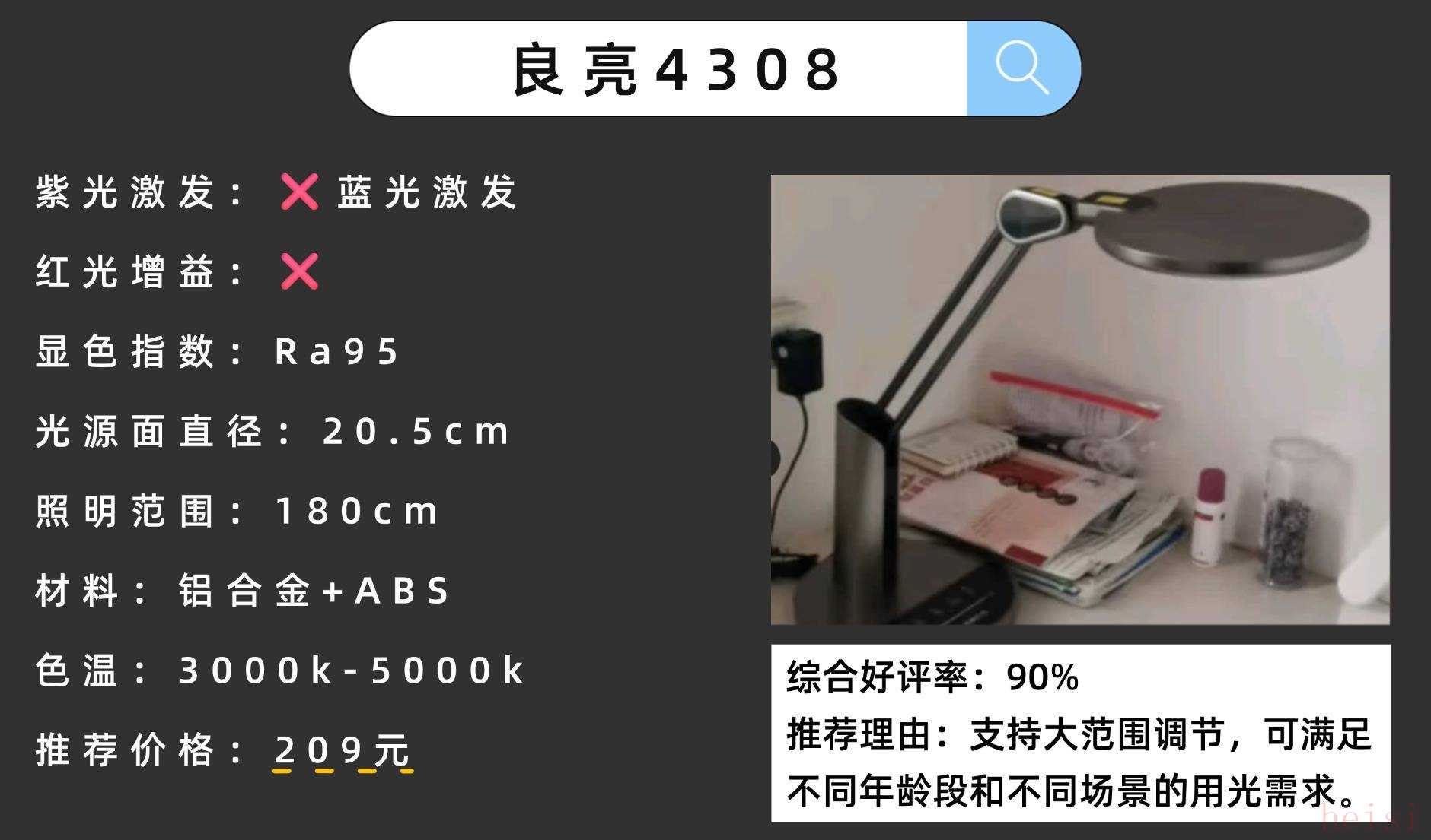 它的色溫范圍比較廣3900K-4600K,可以根據(jù)需求調(diào)節(jié)色溫。雖然其采用的是側(cè)發(fā)光的方式,但在使用時(shí)仍然會(huì)存在炫光刺眼現(xiàn)象,且還要值得注意的是他并不是全光譜光源,護(hù)眼效果沒有全光譜光源的臺(tái)燈好。精選高性價(jià)護(hù)眼臺(tái)燈6:良亮4308護(hù)眼性能:均勻柔和的大面積照明,分段調(diào)光可減少眼睛疲勞。官網(wǎng)價(jià)格:209元性價(jià)比指數(shù):★★★★☆(照明范圍大,功能實(shí)用,但觸控靈敏度偶爾略低)推薦理由:支持大范圍調(diào)節(jié),可以滿足不同年齡段和不同場(chǎng)景的用光需求。