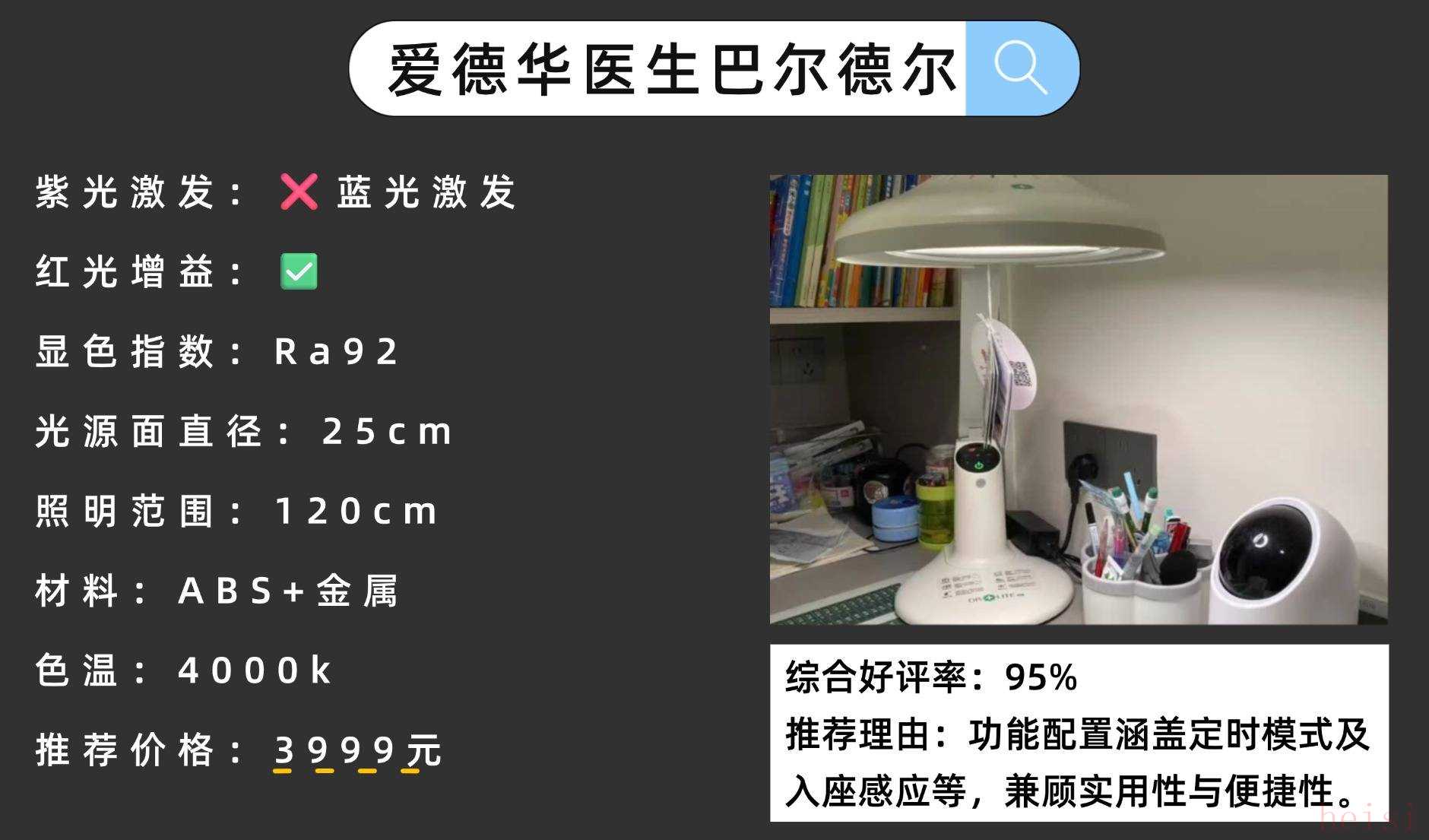 它支持多角度調(diào)節(jié),最大翻轉(zhuǎn)角度達(dá)160°,既能根據(jù)使用需求靈活調(diào)整照明方向,又可輕松折疊收納有效節(jié)省桌面空間,實(shí)用性較強(qiáng)。精選高性價(jià)護(hù)眼臺(tái)燈4:愛德華醫(yī)生巴爾德爾之光護(hù)眼性能:25cm發(fā)光面,直發(fā)光+智能調(diào)光+定時(shí)+入座感應(yīng),功能全面。官網(wǎng)價(jià)格:3999元性價(jià)比指數(shù):★★★☆☆(功能豐富,光線均勻度一般)推薦理由:功能配置涵蓋定時(shí)模式及入座感應(yīng)等,兼顧實(shí)用性與便捷性。
