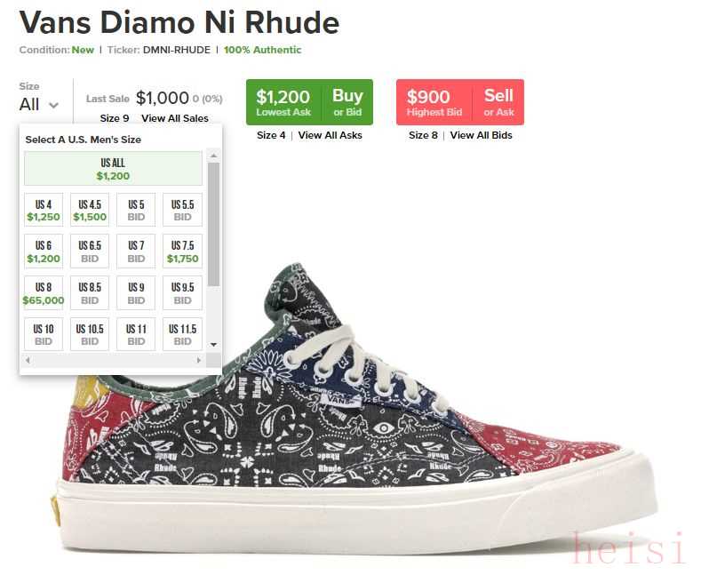 當(dāng)然也包括下面這雙帶有“腰果花”元素的Rhude × Vans聯(lián)名帆布鞋,至于小編為何拿出這雙Vans舉例,自然是因?yàn)樗诙壥袌觥安豢茖W(xué)”的價格,試問有幾個聯(lián)名單位能讓Vans鞋“炒到”1W+?可品牌Rhude卻“肉眼可見”的做到了!
