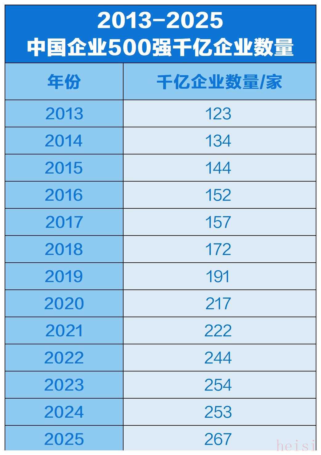2025中國企業(yè)500強中,營業(yè)收入超過1000億元的企業(yè)數(shù)量為267家,較上年增加14家,千億級企業(yè)占比達53.4%。
