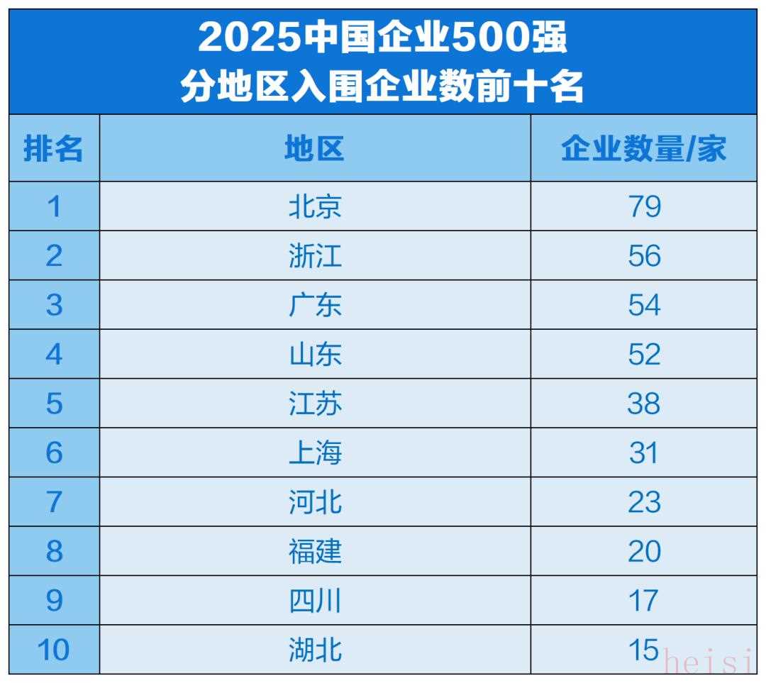 2025中國(guó)企業(yè)500強(qiáng)共分布在30個(gè)?。ㄗ灾螀^(qū)、直轄市)中,分布最多的五個(gè)地區(qū)依次是北京、浙江、廣東、山東和江蘇。