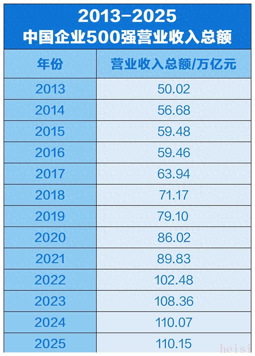 2025中國(guó)企業(yè)500強(qiáng)營(yíng)業(yè)收入達(dá)110.15萬億元,較上年500強(qiáng)有所增加。資產(chǎn)總額為460.85萬億元,增長(zhǎng)7.46%。