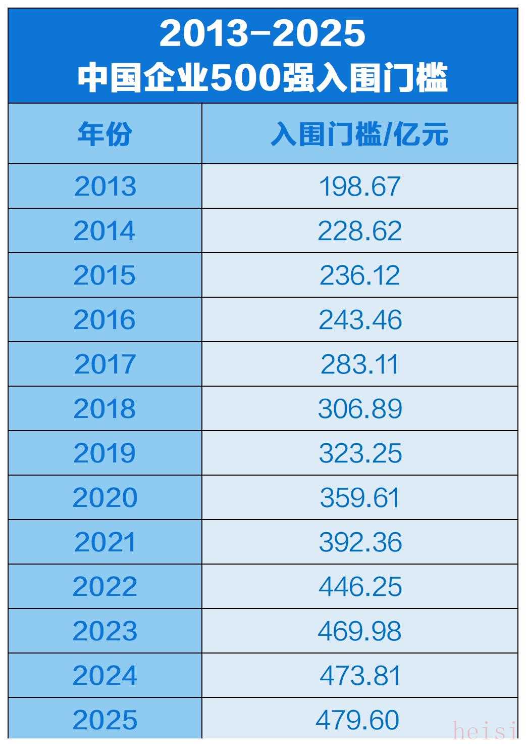 2025中國(guó)企業(yè)500強(qiáng)入圍門檻達(dá)到479.60億元,提升5.79億元,實(shí)現(xiàn)23連升。