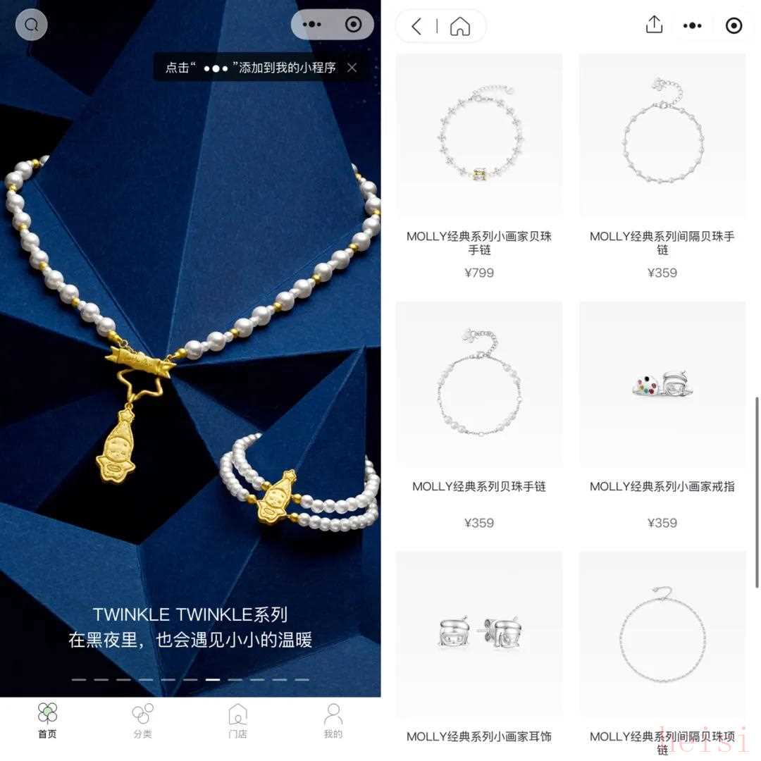 在本次推出足金飾品以前,popop的產(chǎn)品大多采用S925銀、貝珠、鋯石等這些本身價(jià)值不算高的材料,涵蓋了LABUBU、HIRONO、MOLLY、SKULL PANDA、TWINKLETWINKLE、星星人等多個(gè)熱門IP,價(jià)格多在319元至2699元之間,基本對(duì)標(biāo)輕奢品牌潘多拉、施華洛世奇等。