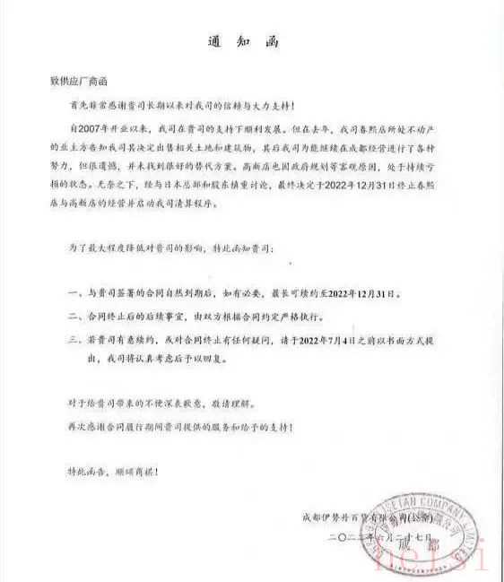 6月27日,一則蓋有成都伊勢丹百貨有限公司公章的《通知函》引來眾多關(guān)注。該函表示,伊勢丹春熙店與高新店將于今年12月31日終止經(jīng)營。