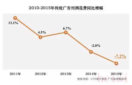 據(jù)央視市場研究媒介智訊近日發(fā)布了一則《2015中國廣告市場回顧》的報告顯示,盡管在互聯(lián)網(wǎng)媒體、戶外新媒體等熱點媒體廣告的增長帶動之下,2015年中國廣告市場仍舊未能擺脫下跌之勢,以2.9%的跌幅收官,而傳統(tǒng)媒體則成為主要下跌板塊,7.2%的跌幅也較2014年進一步有所擴大。