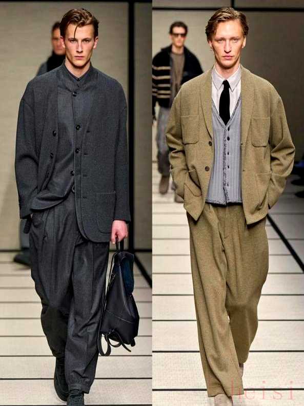 阿瑪尼把非結(jié)構(gòu)化夾克做成單層,肩膀沒墊肩,袖子卻收窄,駝背穿上去,后領(lǐng)空出半個拳頭,像借來的衣服。