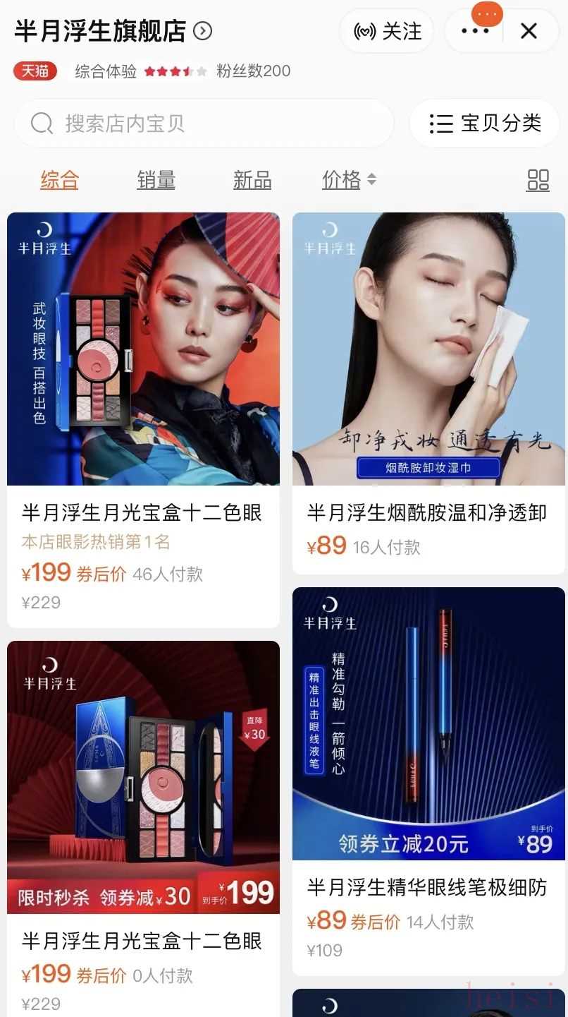 根據(jù)上述公眾號的介紹,半月浮生從產(chǎn)品研發(fā)到外觀設(shè)計的籌備期超過了400天。目前共有4個產(chǎn)品在售,包括12色月光寶盒眼影盤、修容高光盤、精華眼線筆以及煙酰胺卸妝濕巾,價格在89元到229元之間。
