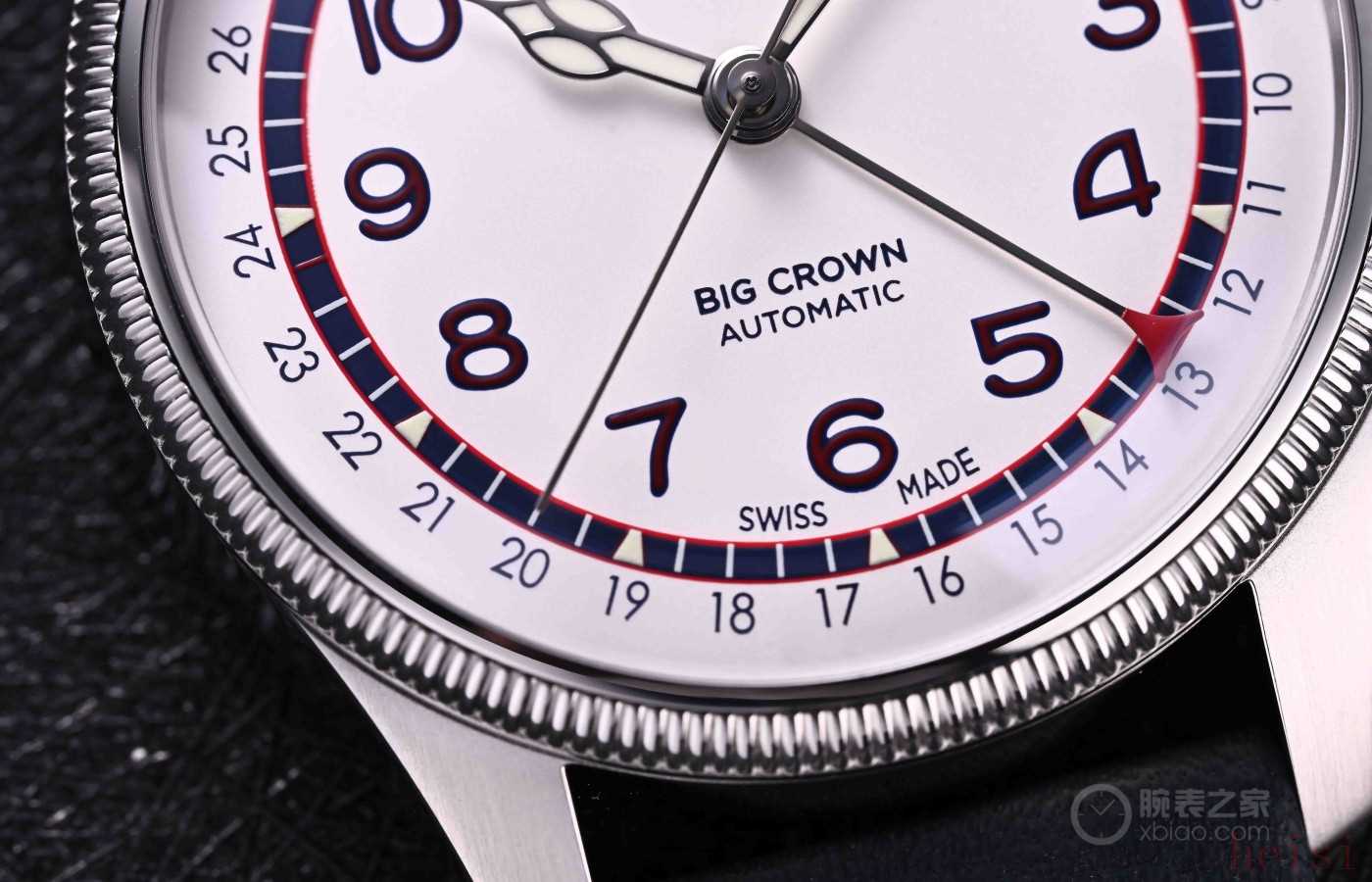 Big Crown系列最早出現(xiàn)于1938年。除了碩大的表冠,它還有一個(gè)標(biāo)志性設(shè)計(jì) ——“指針式日歷”。那根帶有紅色箭頭的額外指針,會(huì)沿著表盤(pán)外圈的1到31刻度走動(dòng),用最直觀的方式告訴你日期。相比小小的日歷窗,這種做法在當(dāng)年簡(jiǎn)直是“大屏顯示”,非常符合航空表講究清晰可讀的精神。