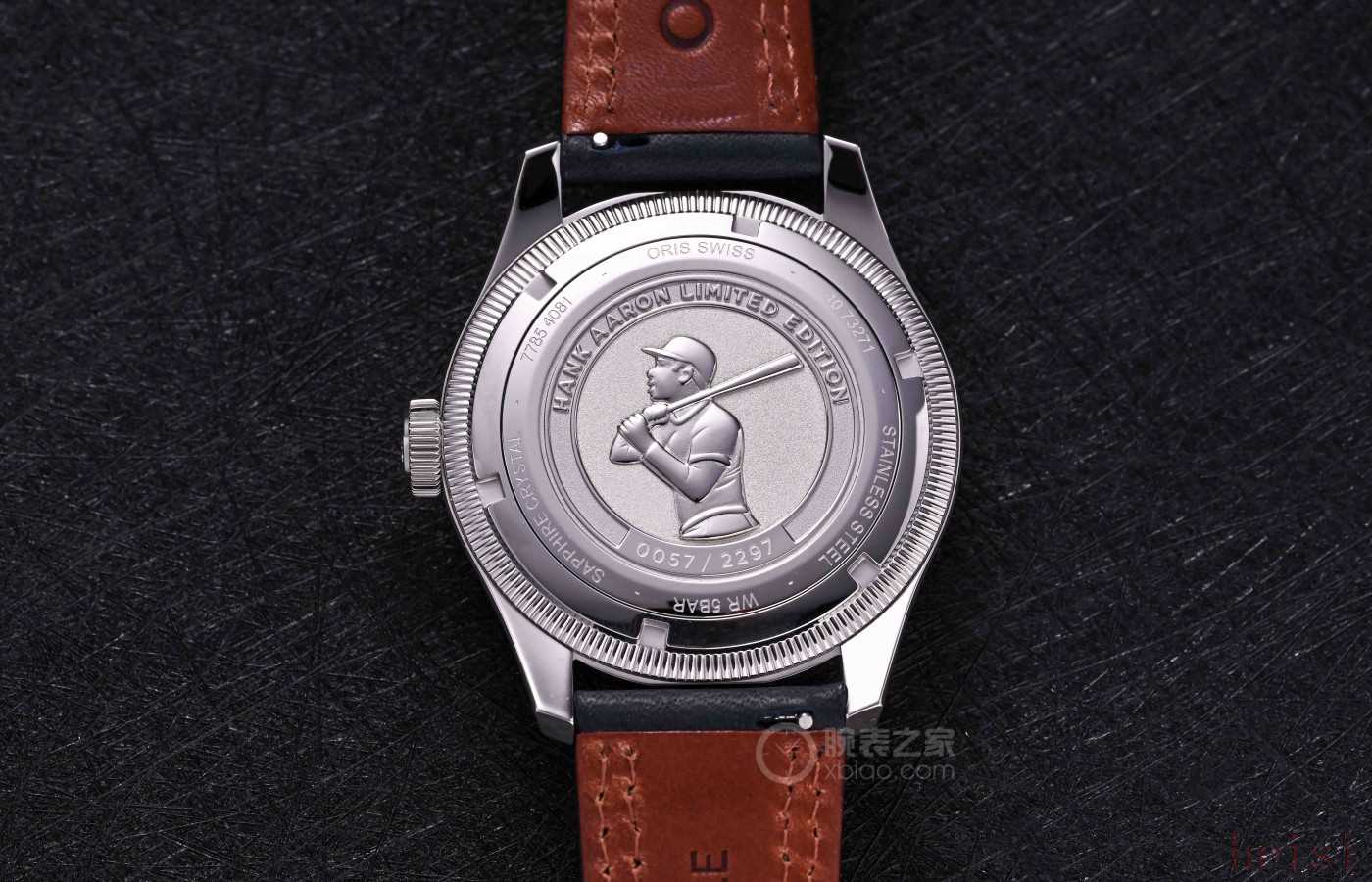 背面是旋入式不銹鋼底蓋,防水等級(jí)是50米,上面還刻有特殊雕刻。雕刻的是棒球名人堂成員,也是歷史上最偉大的球員之一,Hank Aaron先生擊球時(shí)的動(dòng)作。Hank Aaron在職業(yè)生涯中完成了2297次打點(diǎn)得分,因此為了紀(jì)念這位名人,豪利時(shí)這枚腕表限量2297枚。