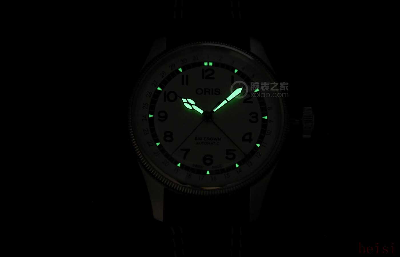 整個(gè)表盤(pán)以白色為主,圈阿拉伯?dāng)?shù)字時(shí)標(biāo),清晰規(guī)整,涂有夜光材料,暗光環(huán)境下依舊能看清。指針同樣做了夜光填充,保證了航空表的實(shí)用傳統(tǒng)。
