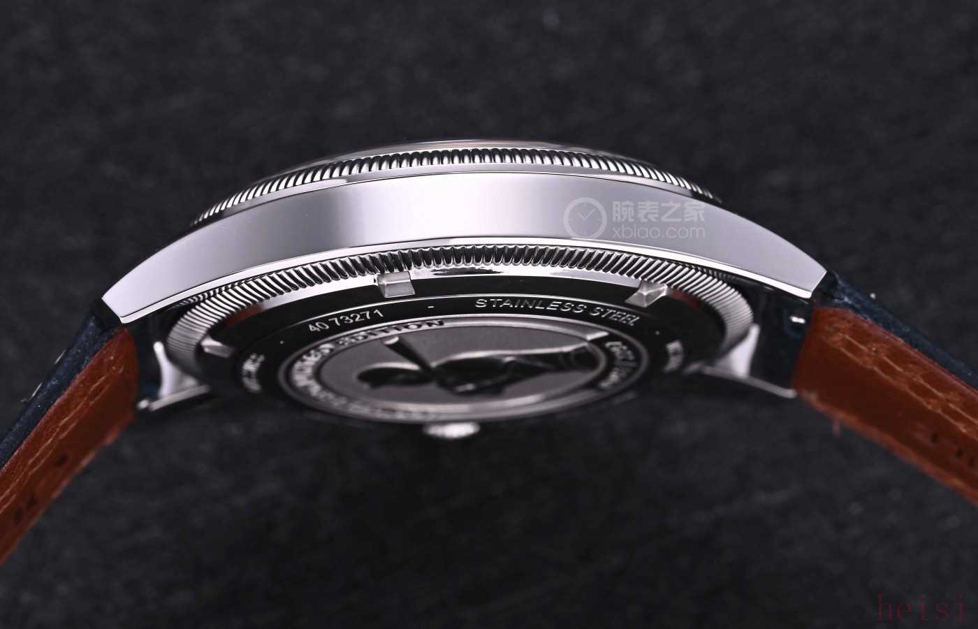 腕表直徑40毫米,厚度12.2毫米,整表77克,表殼采用不銹鋼材質(zhì),線條圓潤(rùn)而不過(guò)于鋒利,既有工具表的硬朗,又帶點(diǎn)復(fù)古的溫潤(rùn)。表圈采用了錢(qián)幣紋設(shè)計(jì),靈感源于古代錢(qián)幣的紋理和圖案,很多主流名表也都在用,這也是Big Crown系列的一大特色,非常具有品牌辨識(shí)度。
