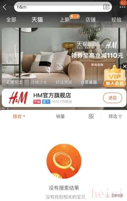 3月24日下午,在京東、拼多多搜索H&M、HM等關(guān)鍵詞,均未顯示相關(guān)店鋪和商品。天貓最新搜索結(jié)果顯示,所有“H&M”和“HM”搜索均無(wú)結(jié)果。