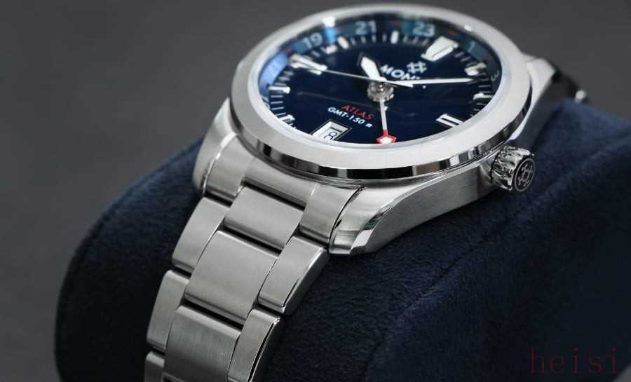 Atlas 獨(dú)特的藍(lán)色表盤擁有多維表圈和立體時(shí)標(biāo),兼具實(shí)用價(jià)值與視覺美感。漆面處理使其呈現(xiàn)出濕潤的外觀,而紅色文字和 GMT 指針的尖端則注入了運(yùn)動(dòng)元素,將 Atlas 提升到了新的高度。