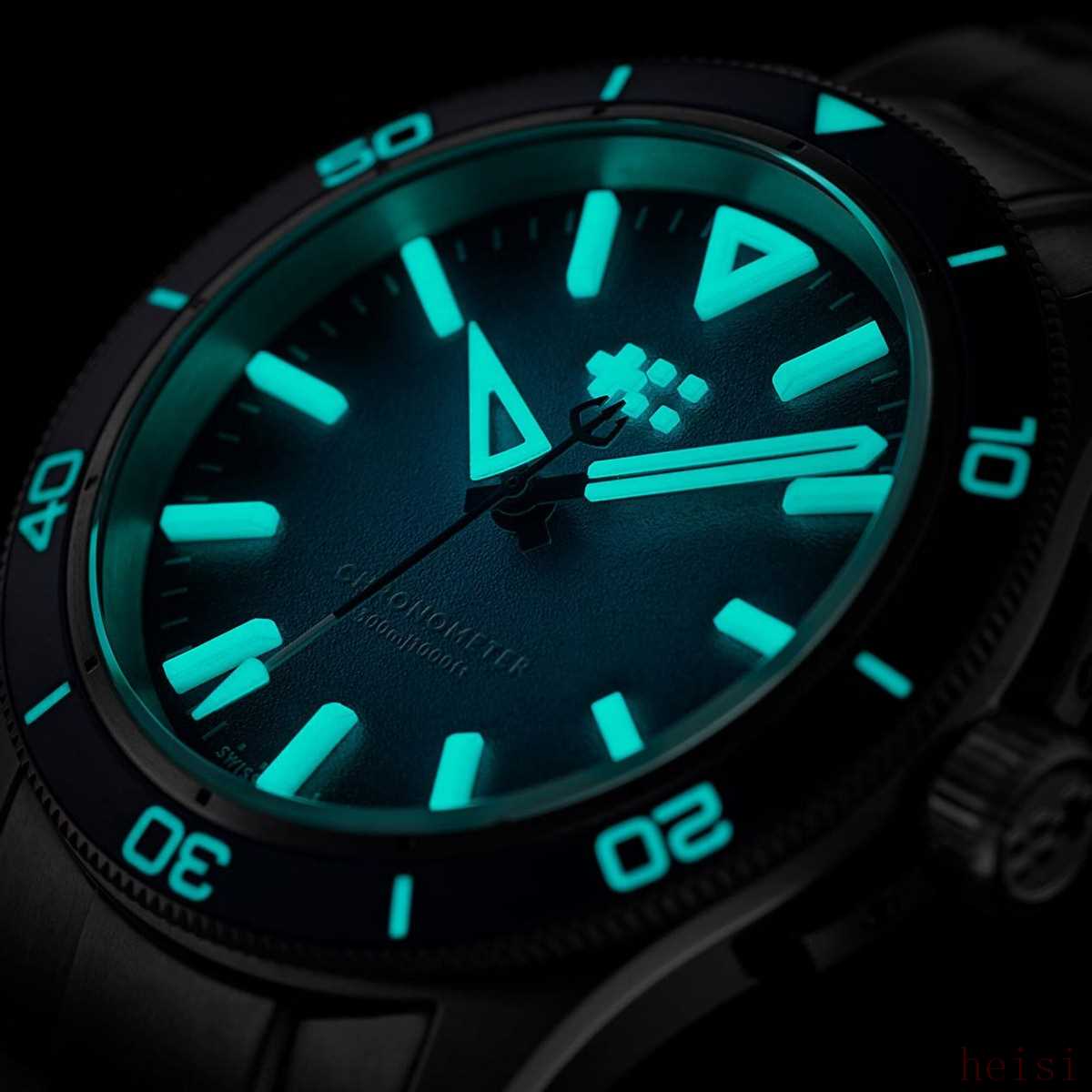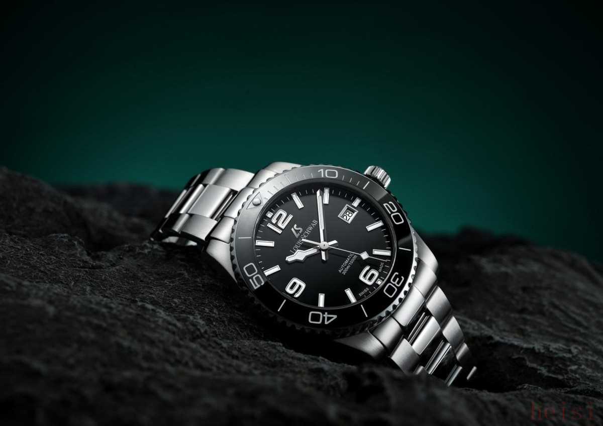 Louis Schwab 潛水表直徑41mm,316L 精鋼表殼表帶,耐磨抗造,裝飾有金屬拋光與拉絲工藝。單向旋轉(zhuǎn)的陶瓷表圈,鐳射的潛水計(jì)時(shí)刻度清晰無比,表圈邊沿的齒輪設(shè)計(jì)。藍(lán)寶石水晶表鏡搭配防眩目鍍膜,任何角度亦能讓佩戴者輕松看清時(shí)間,不被反光干擾。鏡面下,阿拉伯?dāng)?shù)字和條形刻度相間分布,充滿活力,而指針刻度上涂滿的 Super-Luminova 夜光材料,在夜晚如同螢火蟲般聚集在表盤上,讓讀時(shí)清晰可見。