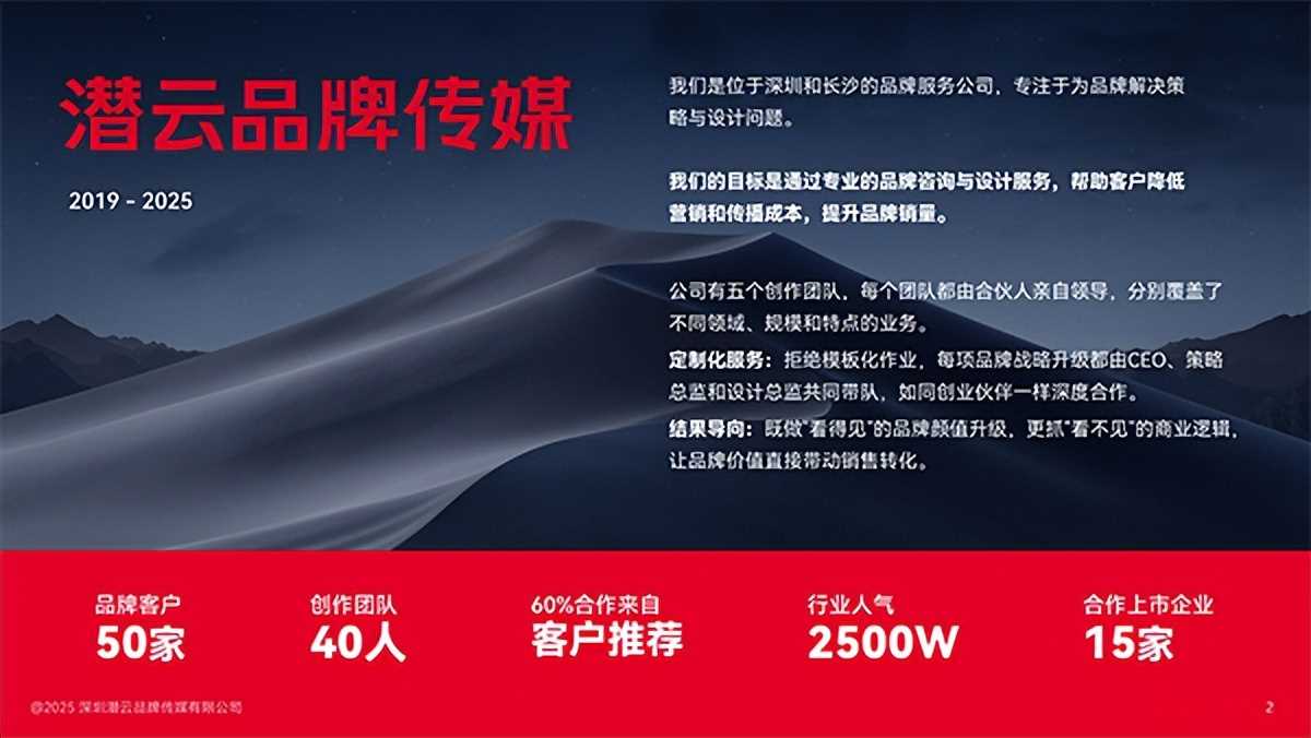 近日,潛云品牌創(chuàng)始人姚捷接受專訪,深入分享了潛云品牌傳媒在品牌策略與設計領域的業(yè)務布局、團隊架構、項目執(zhí)行經(jīng)驗以及對行業(yè)的獨到洞察,展現(xiàn)了潛云如何賦能品牌價值,實現(xiàn)快速發(fā)展。在快速變化的商業(yè)環(huán)境中,潛云品牌傳媒以其獨特的“不設限,向前一步”的理念,為知名品牌與新銳品牌提供定制化品牌策略與設計服務,幫助客戶降低營銷和傳播成本,提升品牌銷量。潛云品牌傳媒,是一家專注于品牌策略與設計的公司,位于深圳和長沙兩地。目前,我們的主要業(yè)務分為兩大板塊:服務于知名品牌和助力細分市場中的新銳品牌。