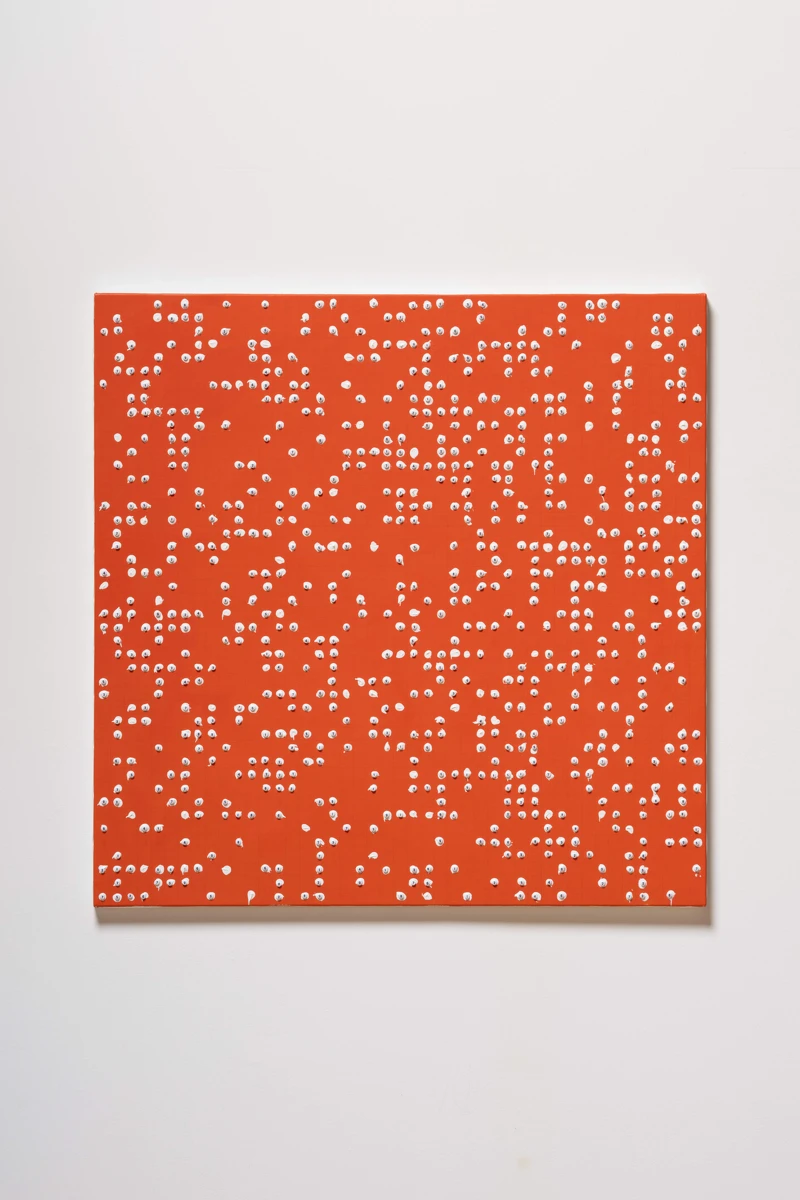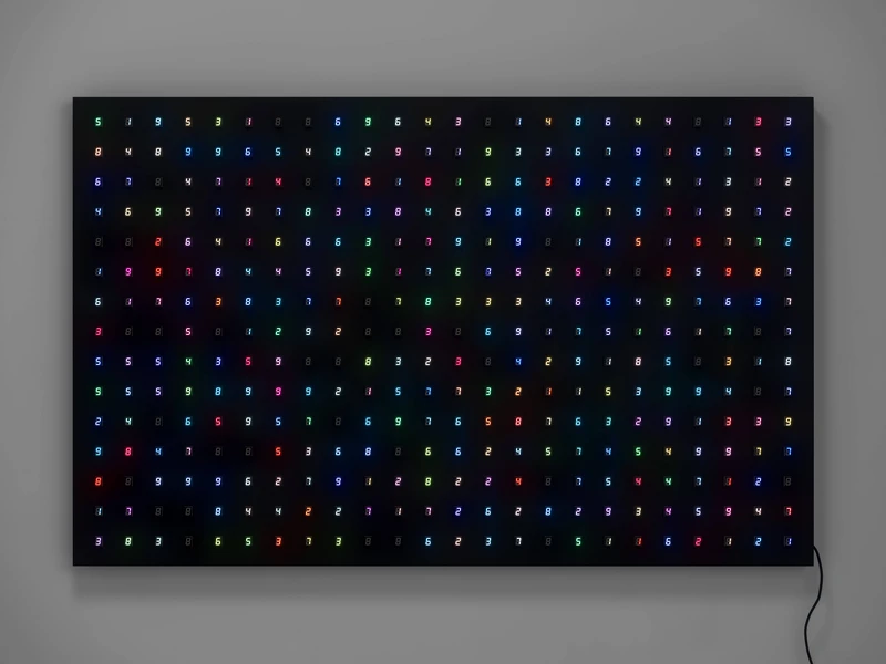 作為佛教徒的宮島,其創(chuàng)作深受佛教思想啟發(fā)。《飛天 – no.9》(2022)與《飛天 – no.12》(2021)以自由流動的數(shù)字光點,喚起敦煌壁畫中飛天的意象,象徵對生命循環(huán)的永恆想像。近年發(fā)展出的《Numerical Beads Painting》系列則捨去 LED 光源,轉(zhuǎn)以隨機計算的圖面,搭配藝術(shù)家在巴黎收集的數(shù)字珠子,大量排列以構(gòu)筑,在畫布中重現(xiàn)數(shù)字的明滅與宇宙的宏觀秩序。