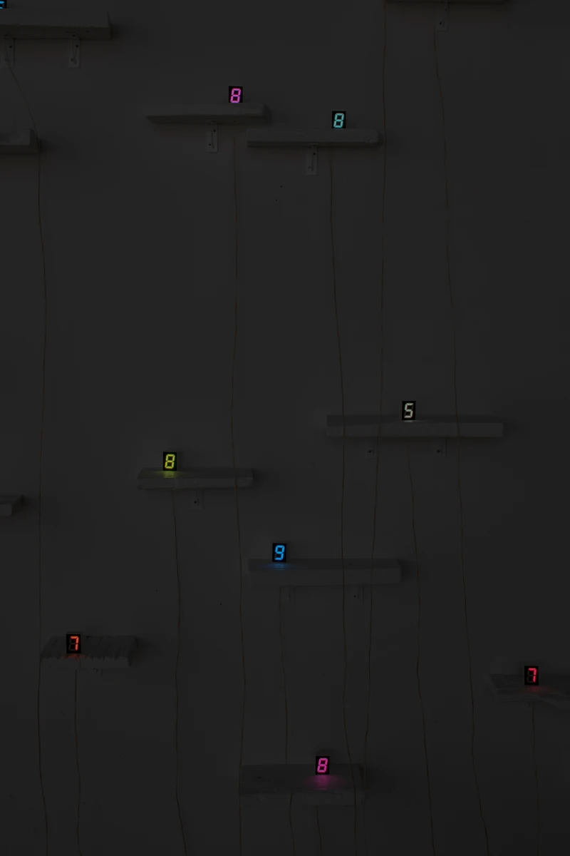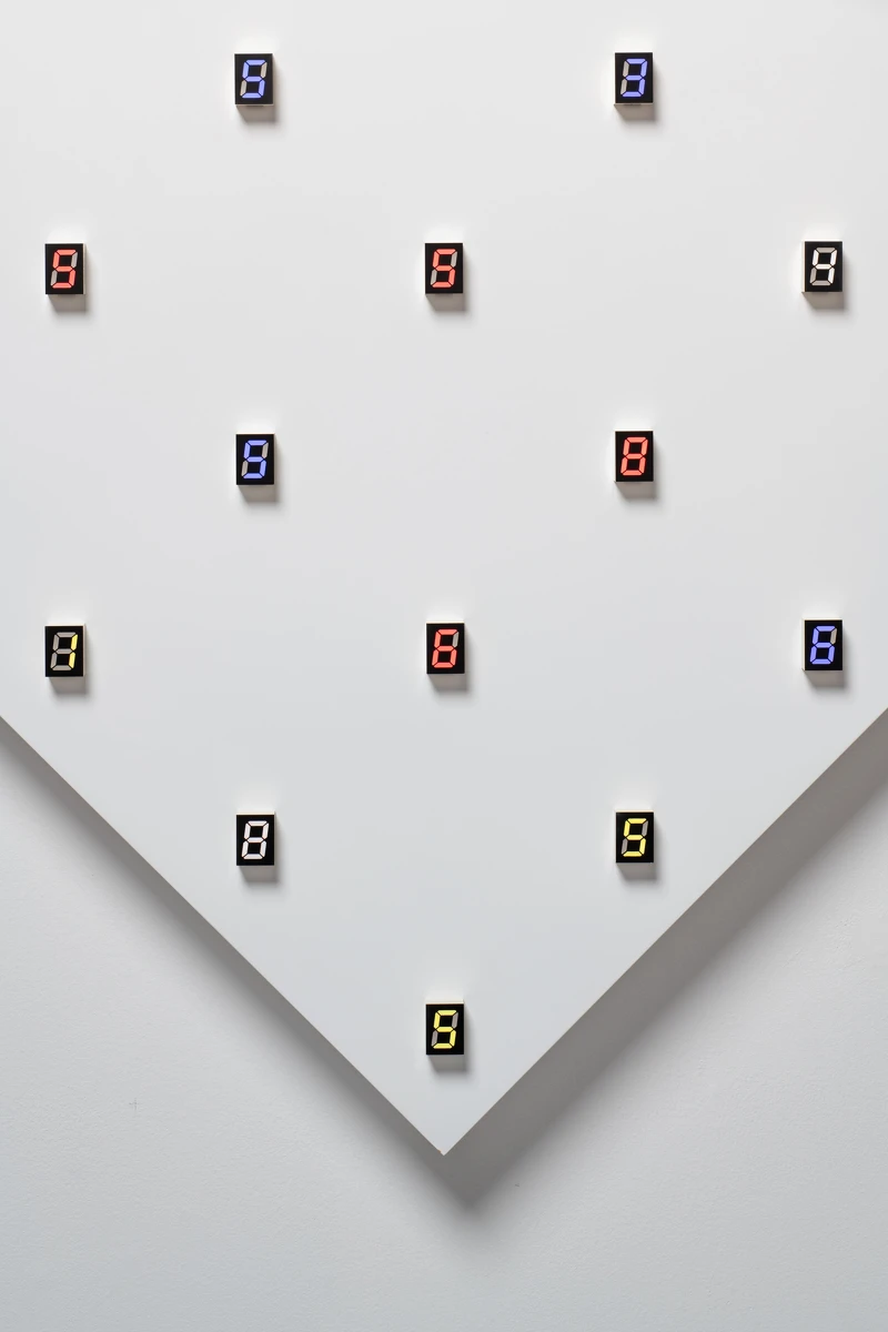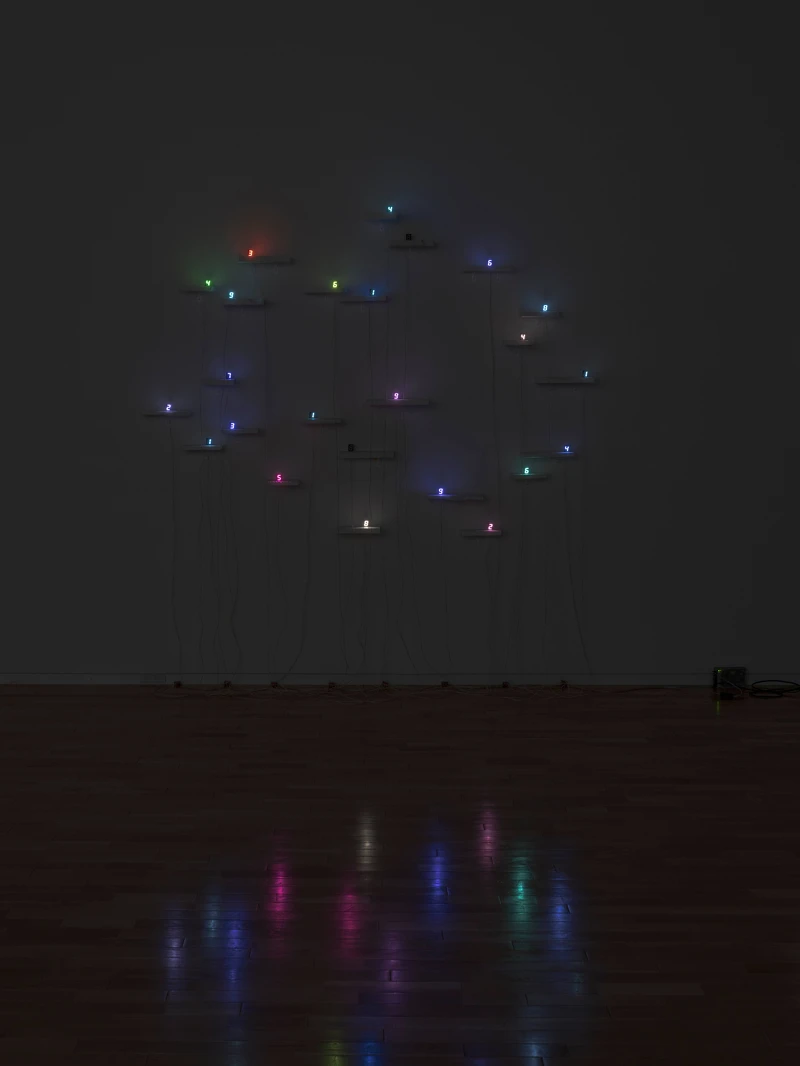 在宮島的藝術(shù)實踐里,數(shù)字持續(xù)循環(huán)與重複,無論是從 1 到 9,或 9 到 1,每一個序列皆象徵一個完整的生命週期。然而在他的作品中始終缺席。在數(shù)列的循環(huán)里,9 之后不是 0,而是一段空白的停頓。這片黑暗彷彿是死亡與重生的瞬間,也呼應(yīng)了佛教中輪迴與轉(zhuǎn)世的哲學(xué)思考。數(shù)字因此以各種形式出現(xiàn) ── 網(wǎng)格、塔樓、錯綜的電路或單純的數(shù)字本身 ── 不斷延展他對時間與空間中的持續(xù)探索。