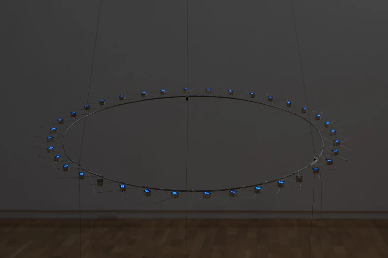另一展間則以為題的 C.F. 系列作品,如《C.F. Aircle - no.2》(2023)與《C.F. Aircle - no.3》(2023),宮島以有機、云狀般纏繞的電線組成扭曲的輪廓,每一件作品猶如漂浮的微型宇宙。它們看似脆弱,卻在閃爍的微光中蘊含不容忽視的價值,正如人類的存在雖短暫卑微,卻無比珍貴,引出藝術(shù)家對的思索。