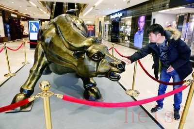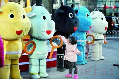 昨日中午,金融街購物中心的西樓門口出現(xiàn)了7頭不同顏色的“?!比伺迹怯扇税缪莸?。而昨日股市一天走勢低迷,但滬指卻在最后臨收盤時刻翻紅,微漲0.07%,報3155.04點。股民就將“牛”人偶與股市聯(lián)系,甚至戲稱“這次終于放對了”。