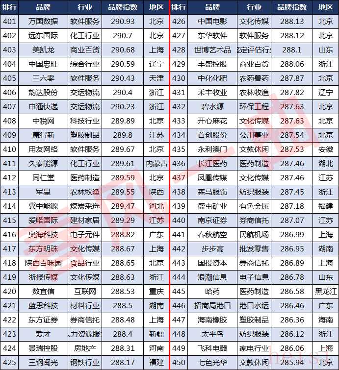 陸家嘴排名第375,湘財證券排名第400;萬國數(shù)據(jù)排名第401,中國電影排名第426;