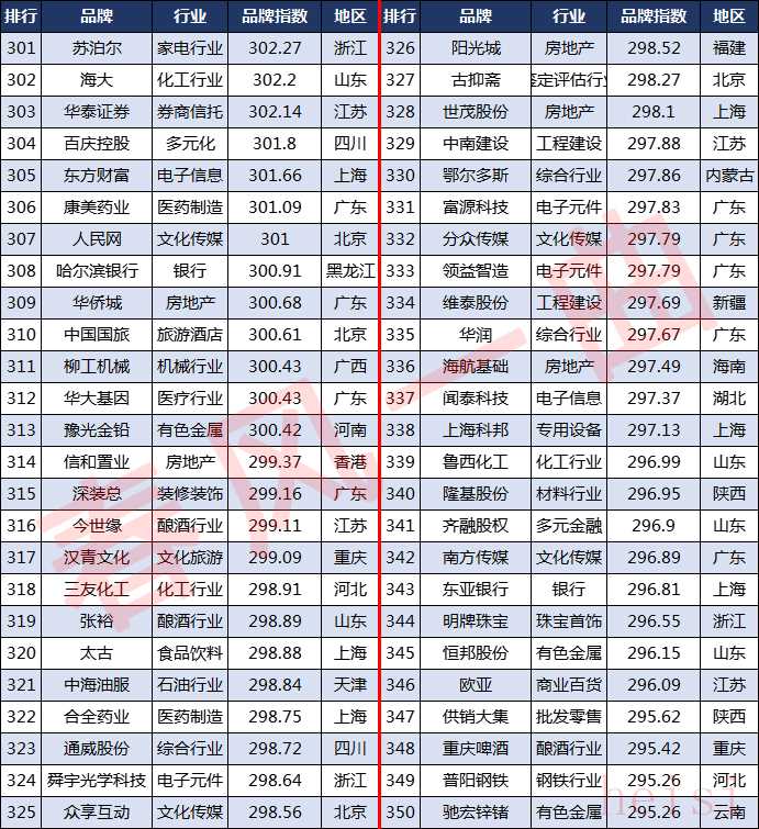 天娛傳媒排名第275,龍源電力排名第300;蘇泊爾排名第301,陽光城排名第326;