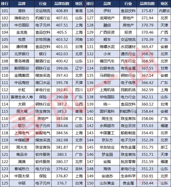 江西銅業(yè)排名第75,頤高集團排名第100;港鐵排名第101,伊利排名第126;