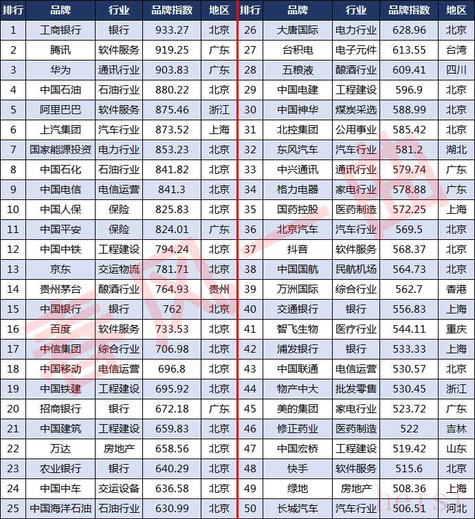 2021年5月專業(yè)品牌評價機構(gòu)Asiabrand(亞洲品牌集團)發(fā)布了最新一期的“2021中國品牌500強”排行榜,今天就來看看中國范圍內(nèi)的500強品牌。榜單顯示,中國工商銀行品牌價值達到3766.75億元,是中國品牌價值最高的品牌;騰訊品牌價值達到3592.7億元,是中國第二大品牌;華為品牌價值達到3511.29億元,是中國第三大品牌;