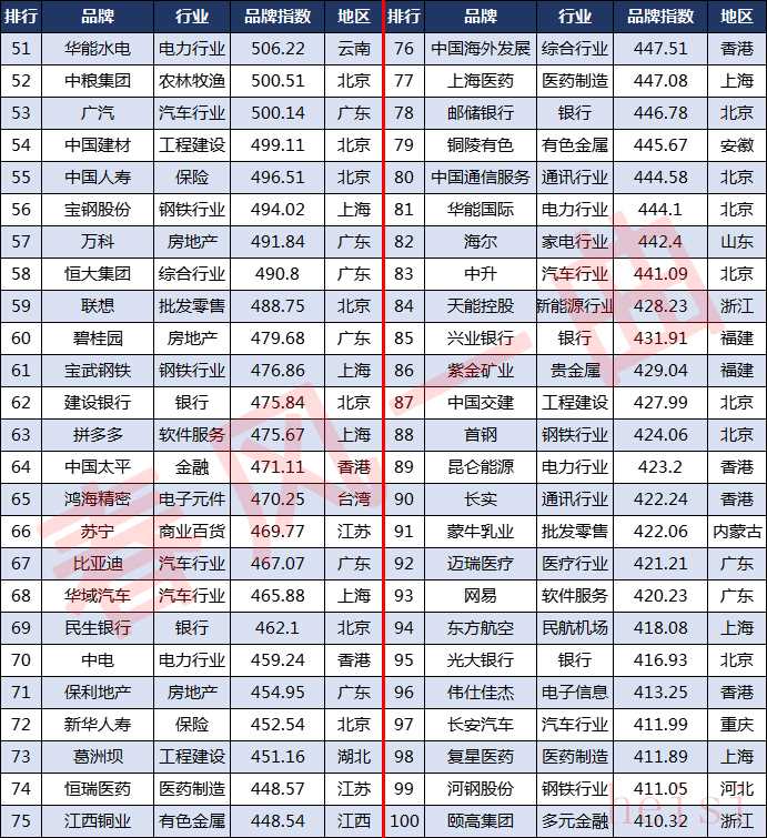 中國海洋石油排名第25,長城汽車排名第50;華能水電排名第51,中國海外發(fā)展排名第76;