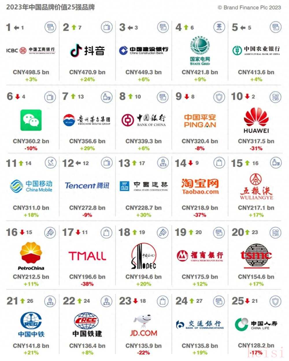 根據(jù)《中國品牌價(jià)值研究院》發(fā)布的《2023年度中國品牌價(jià)值500強(qiáng)榜單》,華為、阿里巴巴、騰訊、中國工商銀行、中國建設(shè)銀行等品牌位列前五。該榜單是對(duì)中國500個(gè)最具價(jià)值品牌進(jìn)行的評(píng)估,評(píng)估標(biāo)準(zhǔn)包括財(cái)務(wù)數(shù)據(jù)、品牌強(qiáng)度、行業(yè)地位等多個(gè)維度。華為以12,799.88億元的品牌價(jià)值繼續(xù)蟬聯(lián)榜首,阿里巴巴以9,699.88億元位列第二,騰訊以8,884.21億元位列第三。
