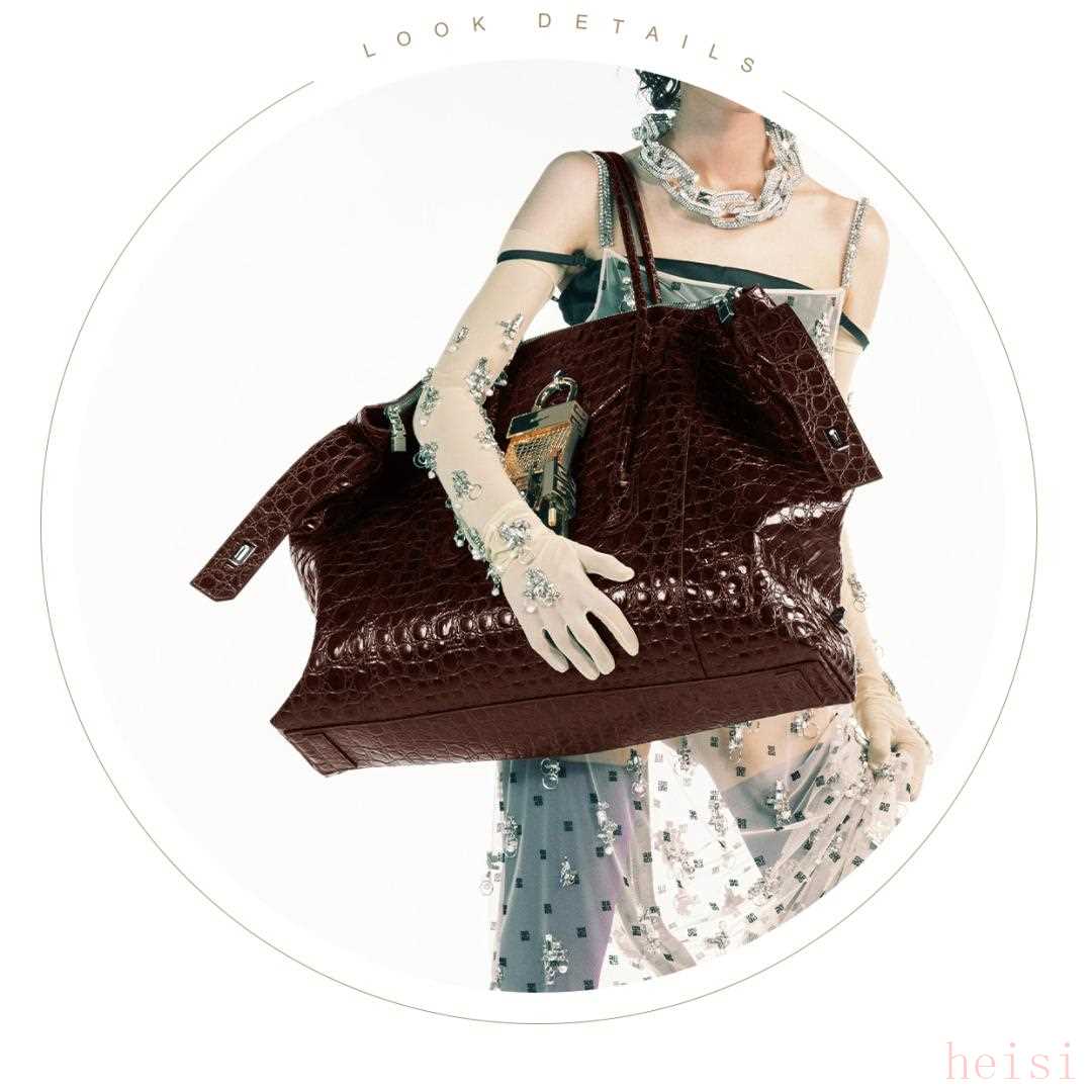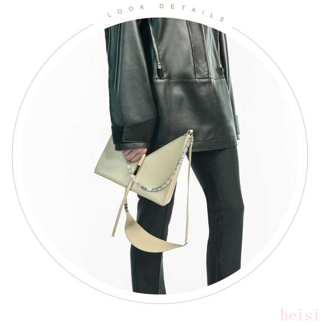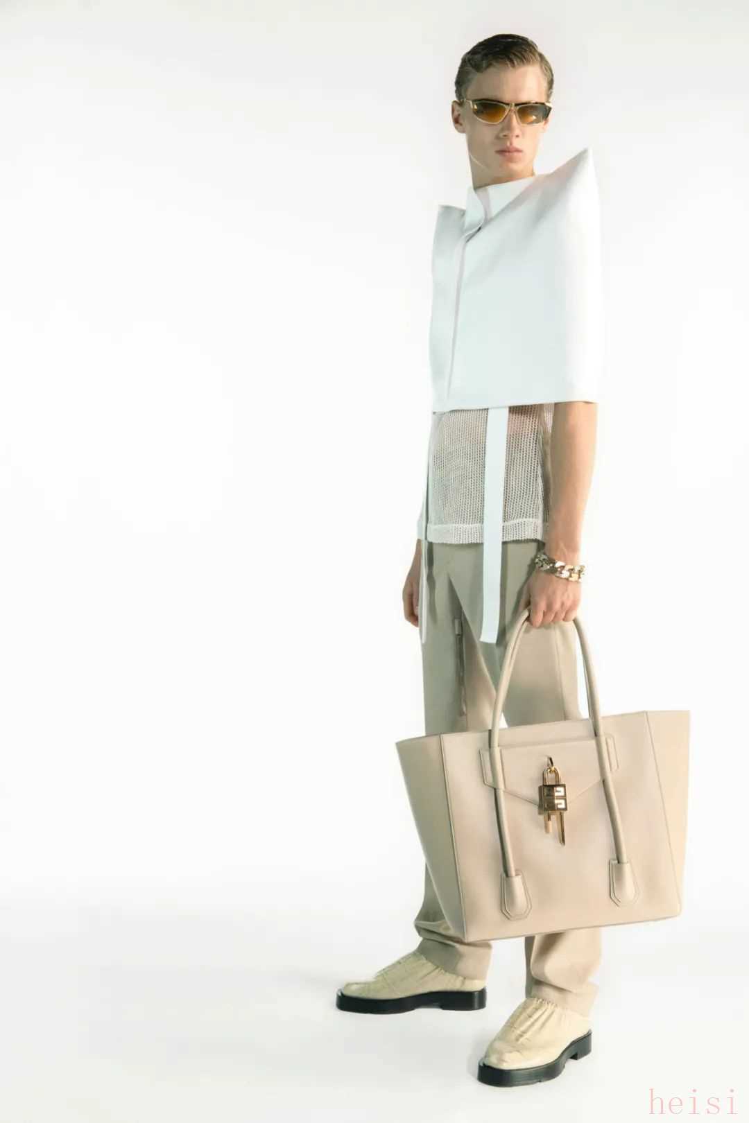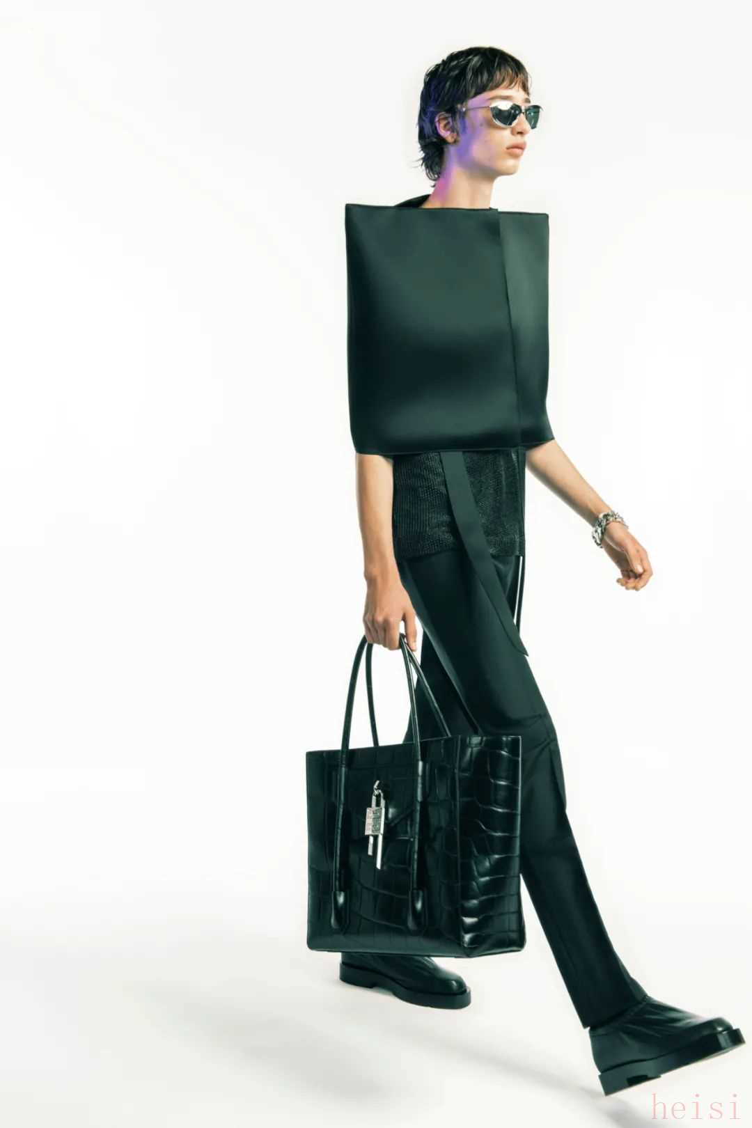 手袋方面,全新推出的手袋系列延續(xù)Givenchy男女皆可使用的中性風,作為Givenchy手袋家族的新成員點綴在系列中。手袋設計經(jīng)過數(shù)次雕琢,擁有考究的剪裁并搭配精致的字母“G”金屬鏈條。Williams大膽地采用了其標志性的科技感面料,將傳統(tǒng)、自然、繁復工藝,與現(xiàn)代科技感完美融合。