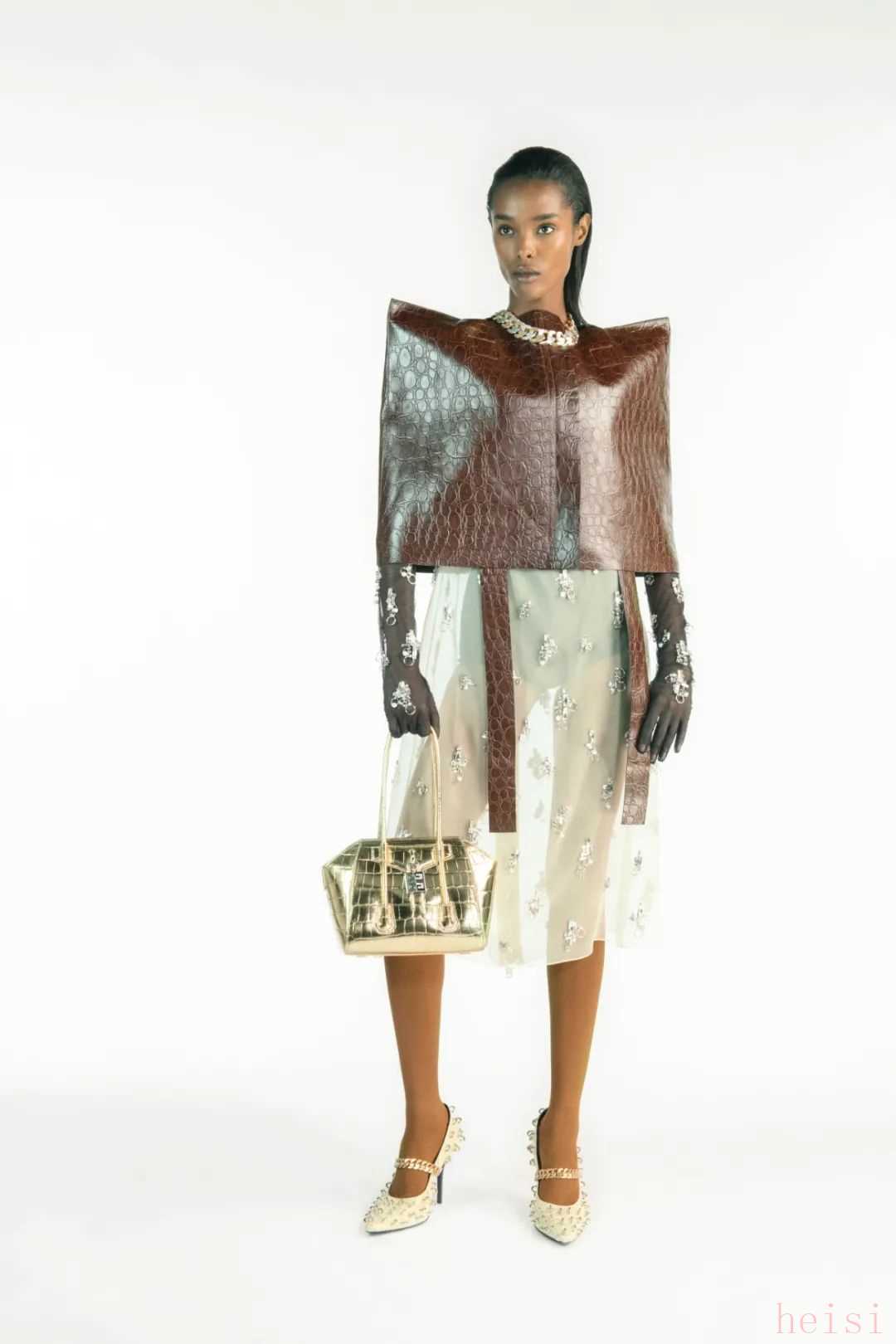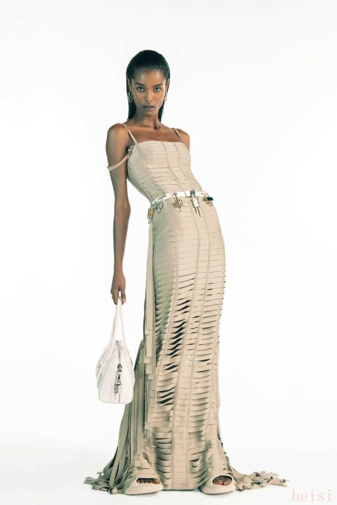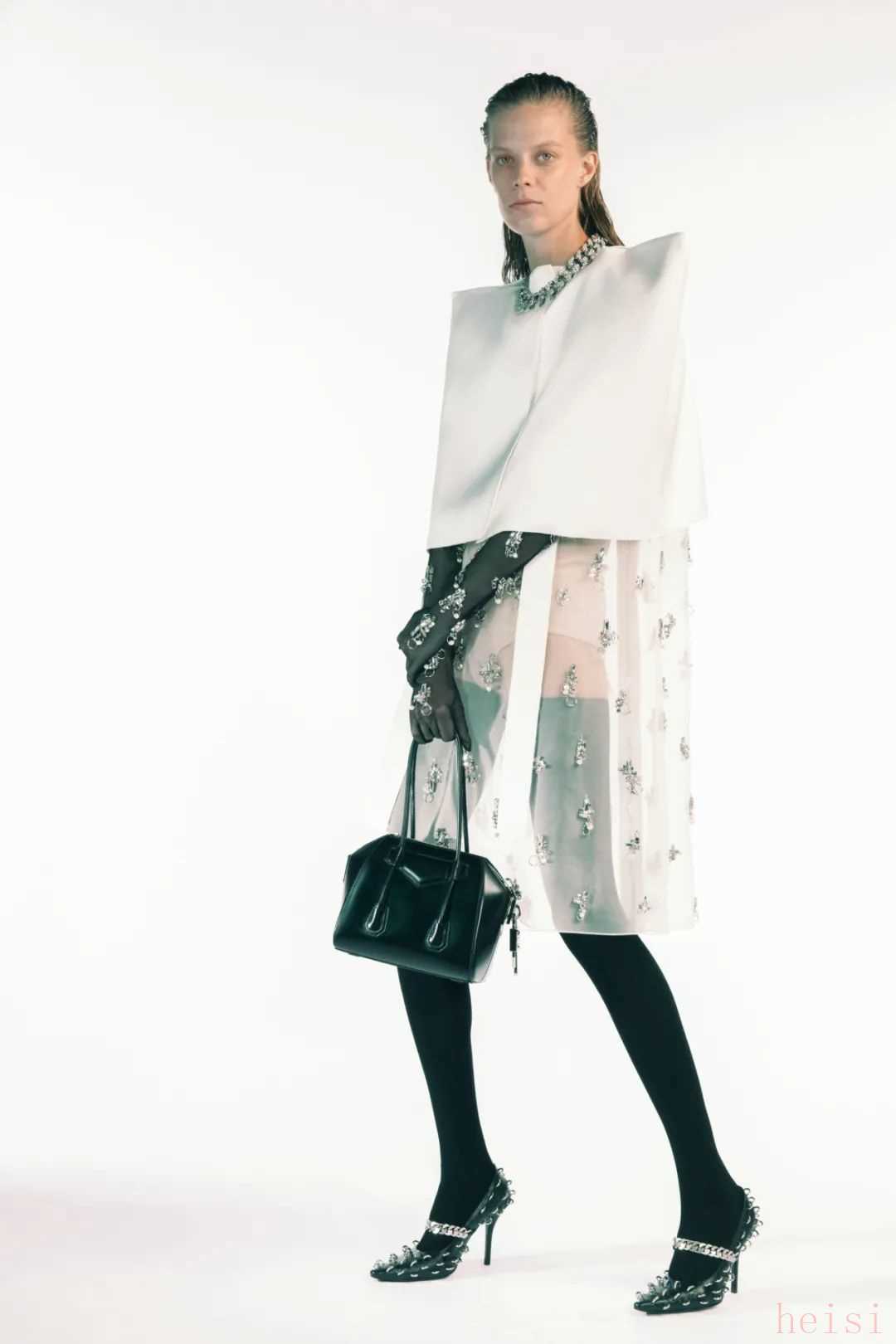本季致敬了品牌過往的經(jīng)典與先鋒設計,從Hubert de Givenchy先生所設計的大面積環(huán)狀褶皺幔帳、空氣感透明材質(zhì)面料、頸部流線型剪裁以及鏤空后背的設計。