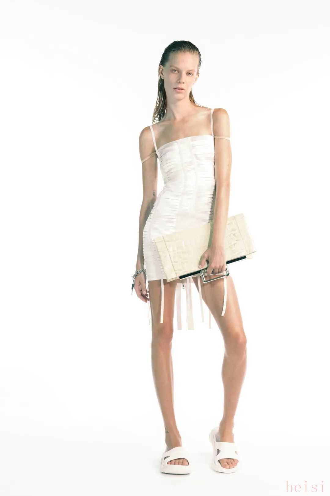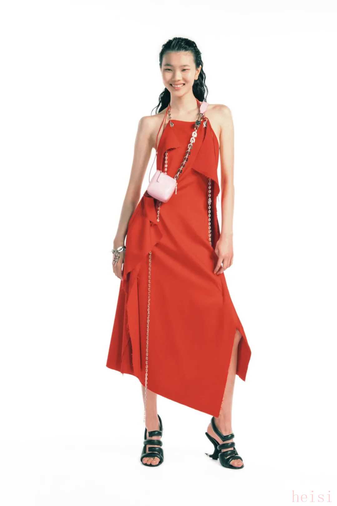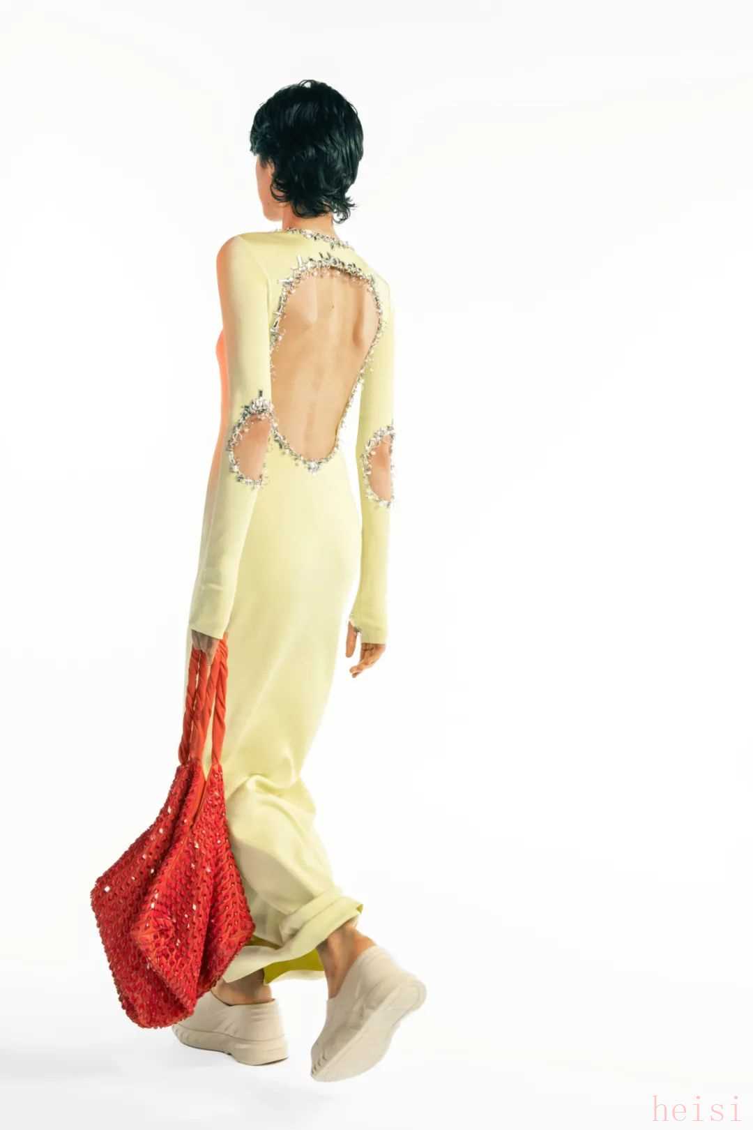 雪紡裁剪的掛脖吊帶,輪廓筆挺,線條行云流水,如同編排般地在那些不對稱的打結(jié)設計與薄紗襯托的裙擺之間,自由浪漫呼之欲出。
